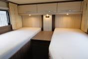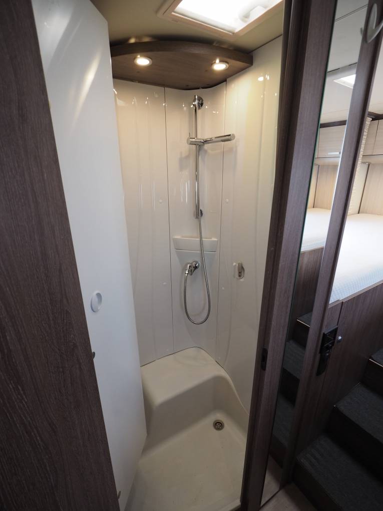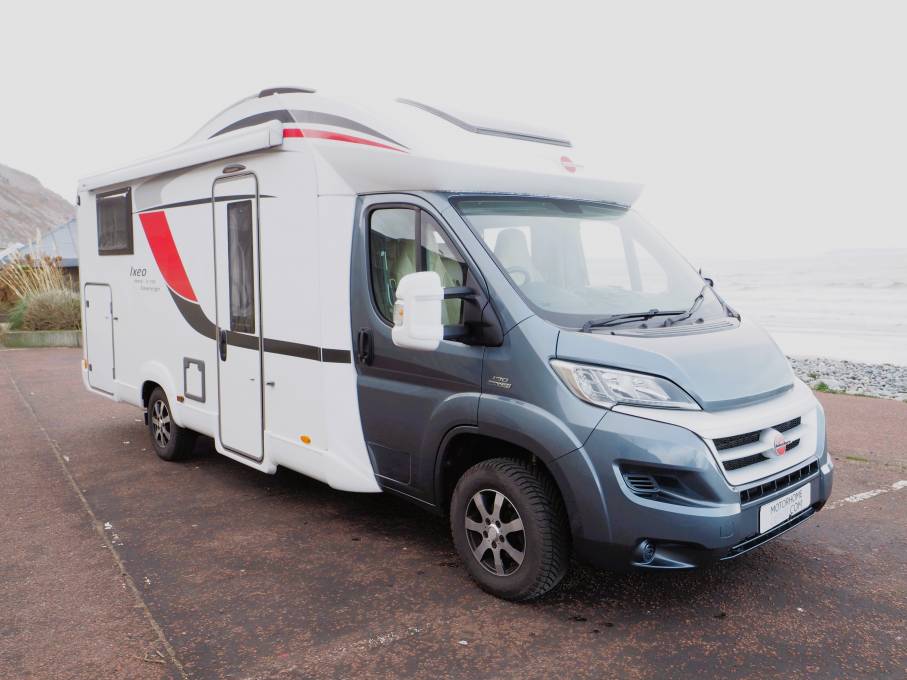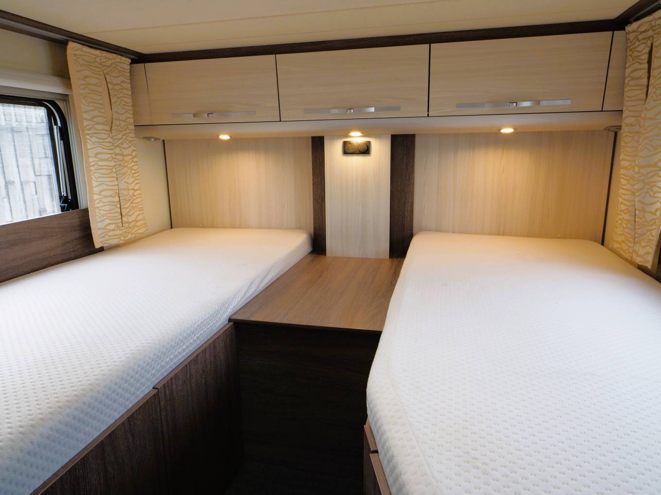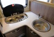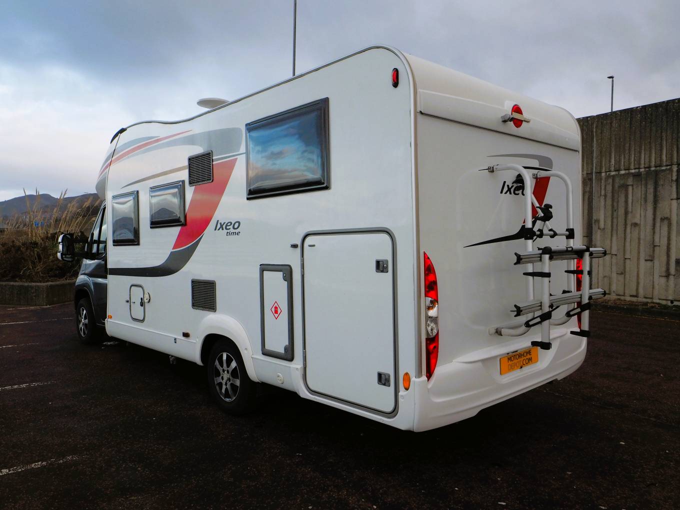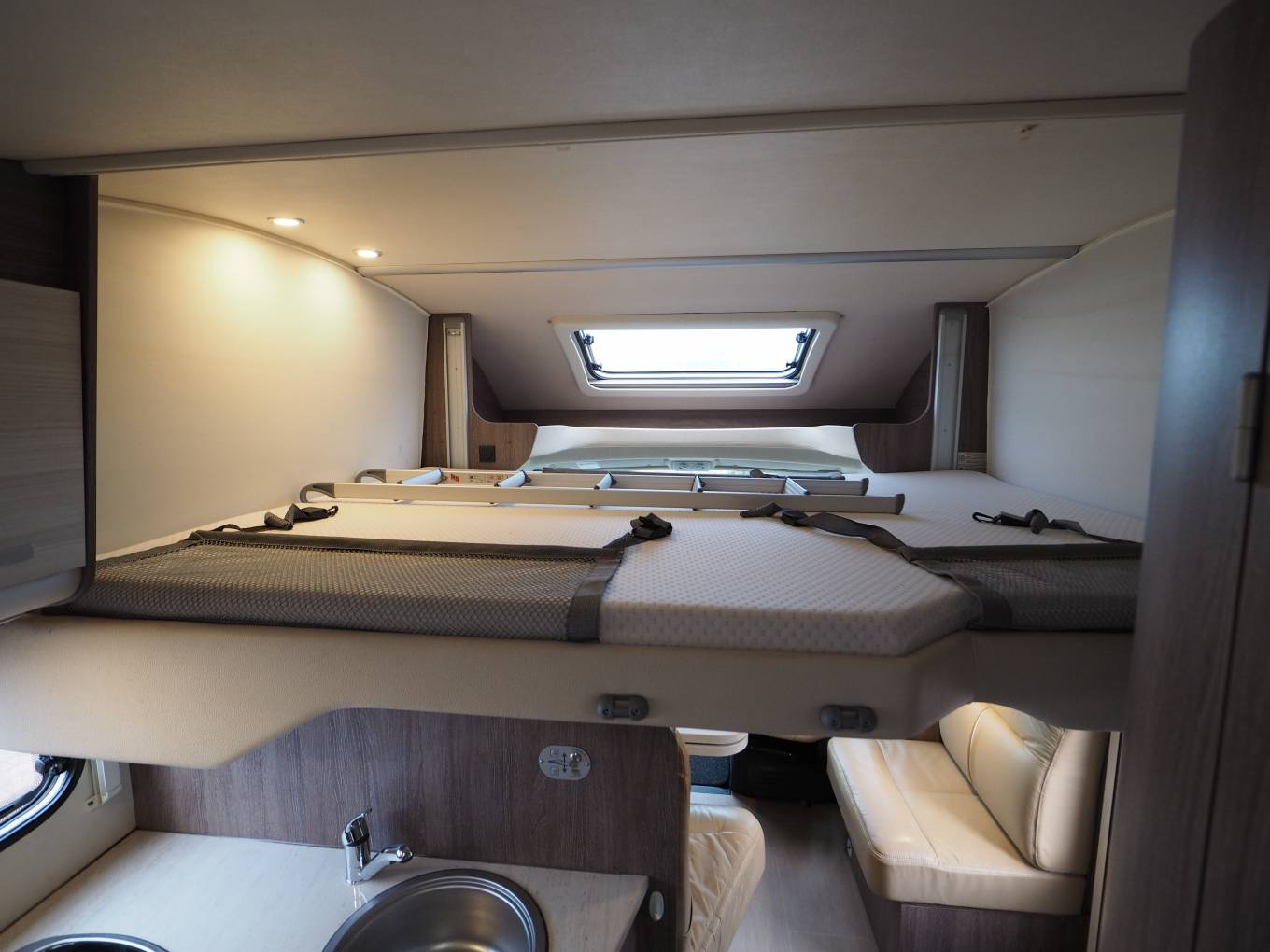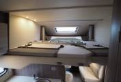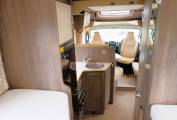 Rear fixed beds and an electronic drop down bed provide comfortable sleeping for 4 adults. The lounge has an L shaped sofa and side chair and the two front captains chairs swivel round to provide seating for 5 if required. The kitchen is well equipped with a 3 burner gas hob, sink and mixer tap, combi oven/grill and a large fridge freezer. The private washroom is designed to maximise space and gives you a flushing cassette toilet, sink with vanity mirror and a swing wall that provides a full size shower cubicle. Plenty of storage in the under-bed wardrobes and overhead lockers. A large garage provides plenty of additional storage and there is a rear bike carrier fitted too.