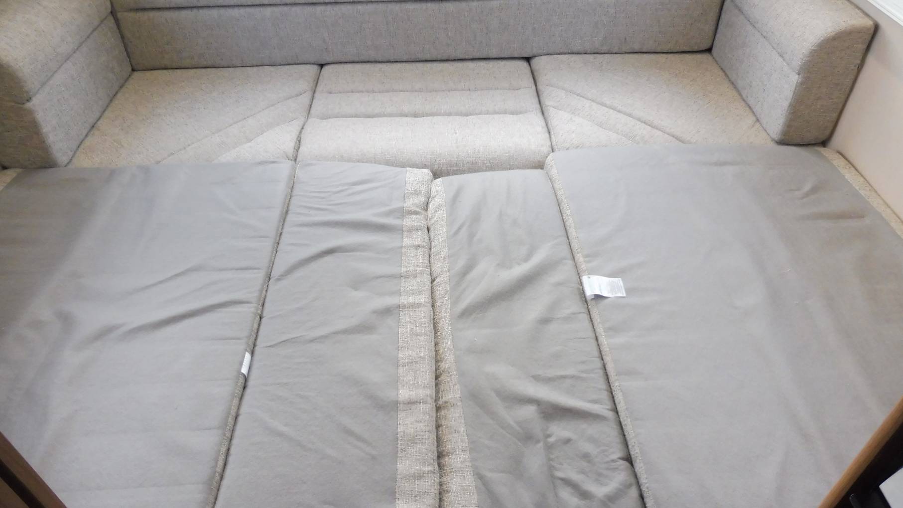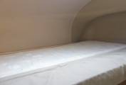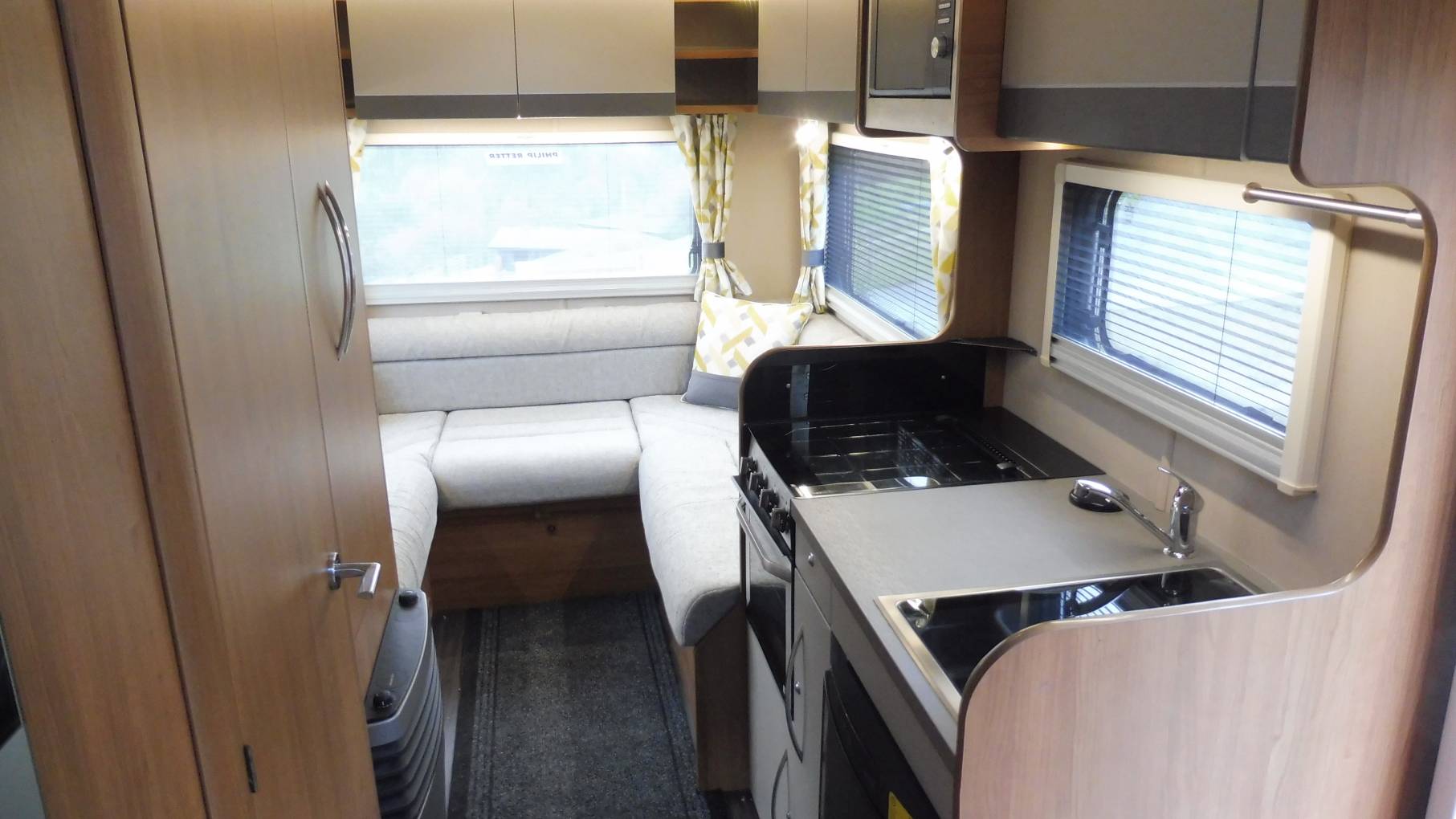 The generous U-shape rear lounge is the star of the show with its spacious settees converting at night into twin singles or a large full width double bed. Deep cushions enhance seating comfort, blinds and fly screens adorn triple aspect panoramic windows and there’s a free-standing stowaway table for dining and entertaining. The cabinetry and overhead lockers add a feeling of quality and give lots of storage options and the upholstery is in excellent condition throughout.
