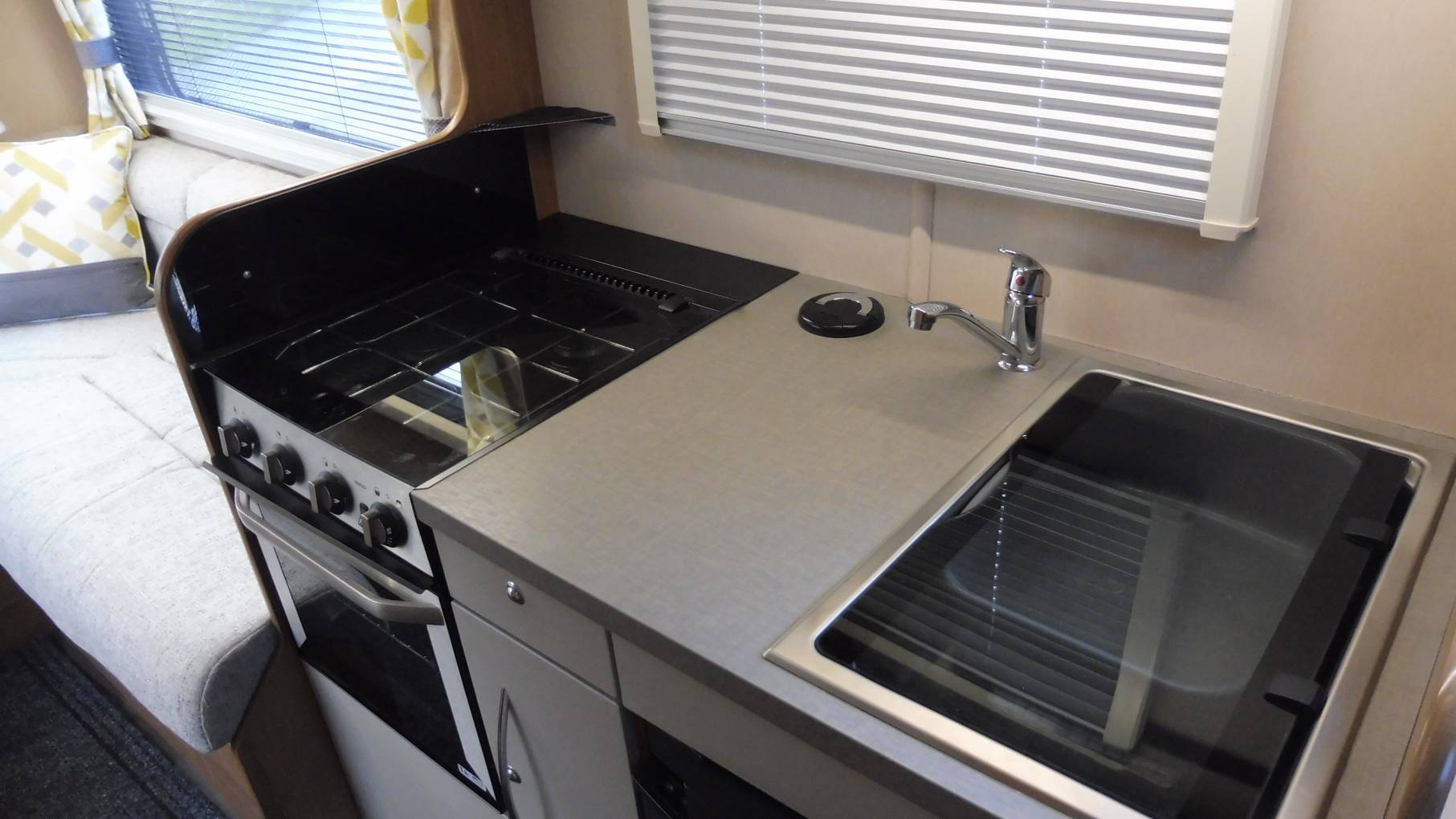 The modern side galley kitchen includes a Dometic fridge freezer, a 3-gas burner and a combination grill and oven below, pull up multi mains socket stack, a microwave, a stainless sink with mixer tap, ceiling mounted dual function extractor fan and worktop food preparation area.