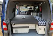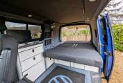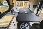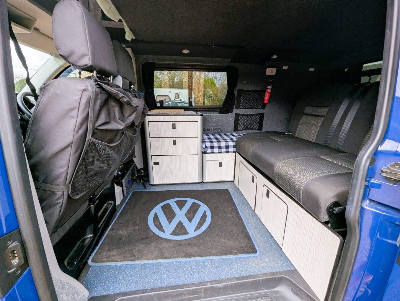 Oversized rims with all terrain tyres, a certified RIB bed with a smooth profile when set down, and a quality pop top make this is a practical family option. The cab and hab' sections are well presented, with VW logo floor mats.