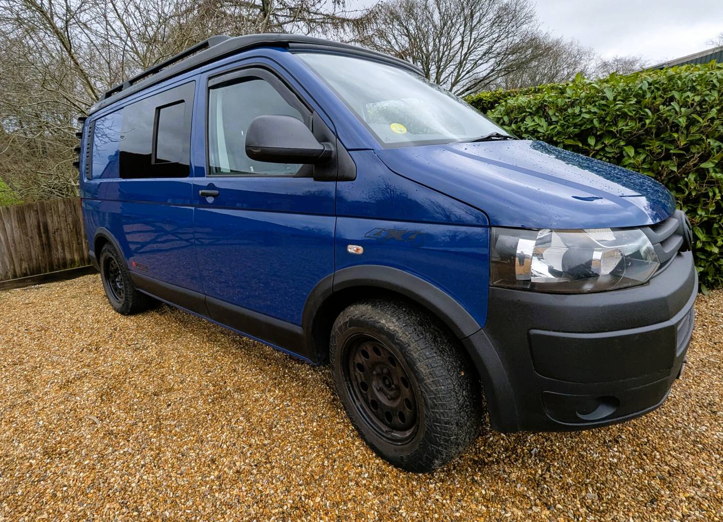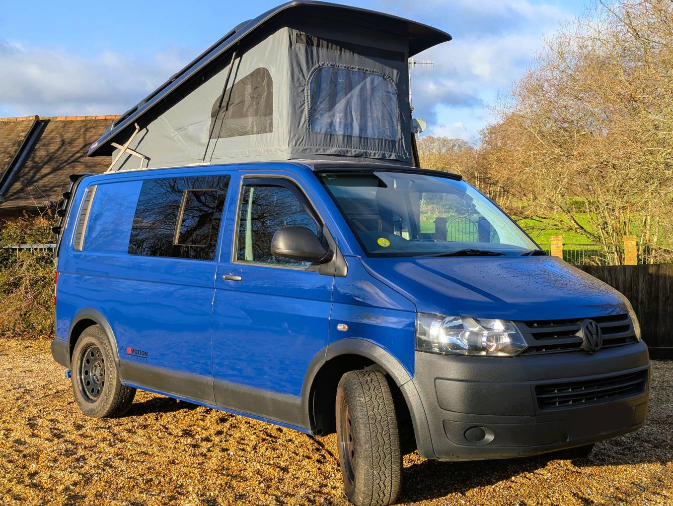 Distinctive VW camper on a rarely found all wheel drive base, excellently cared for, with five belted seats and sleeping for up to five, too. View near Battle in East Sussex.