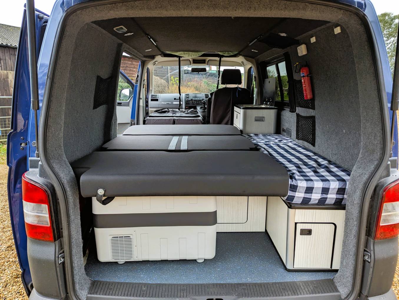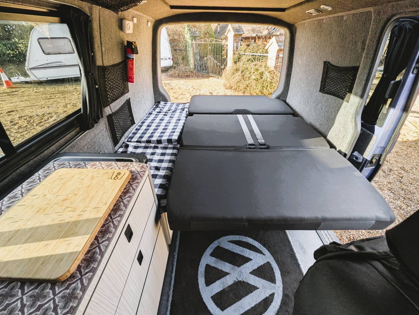 There is a lot of storage throughout, under seats, and in cupboards as well as the rear shelf under which is found a compressor cool box. The latter runs off a solar panel (portable, removable and supplied) for effective off grid stays. The leisure battery is charged from the solar and via a split charge relay system, there is an RCD unit, smoke alarm, fire extinguisher, levelling chocks and 230v lead to help get you started, too.