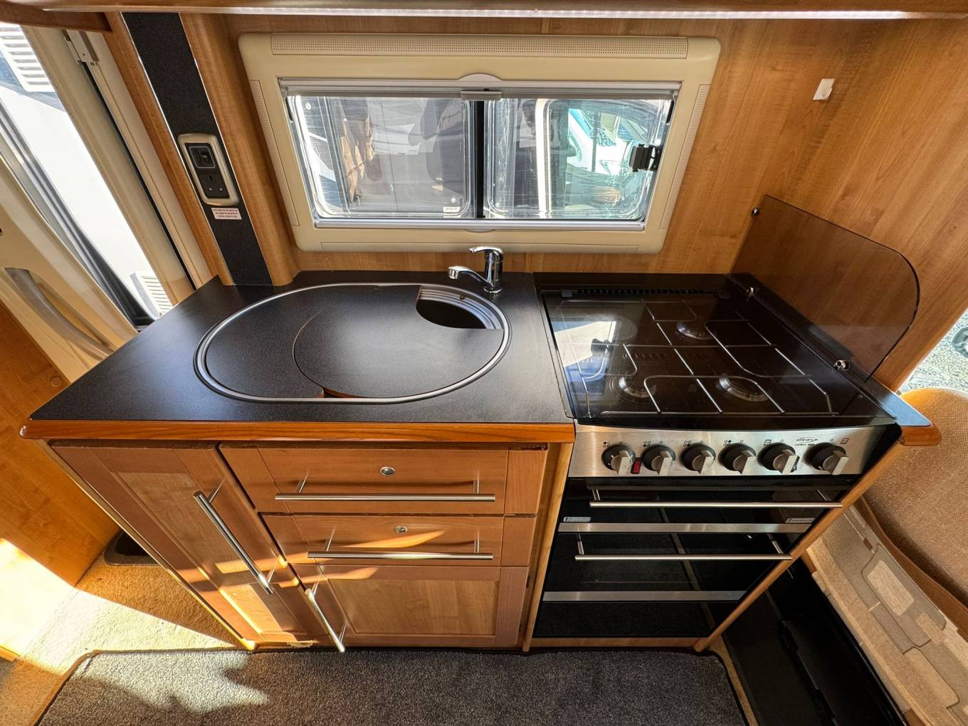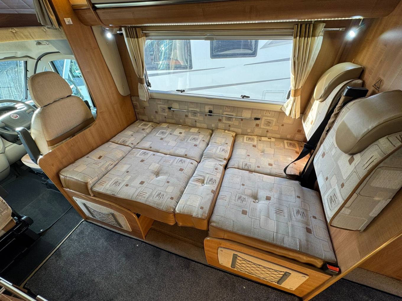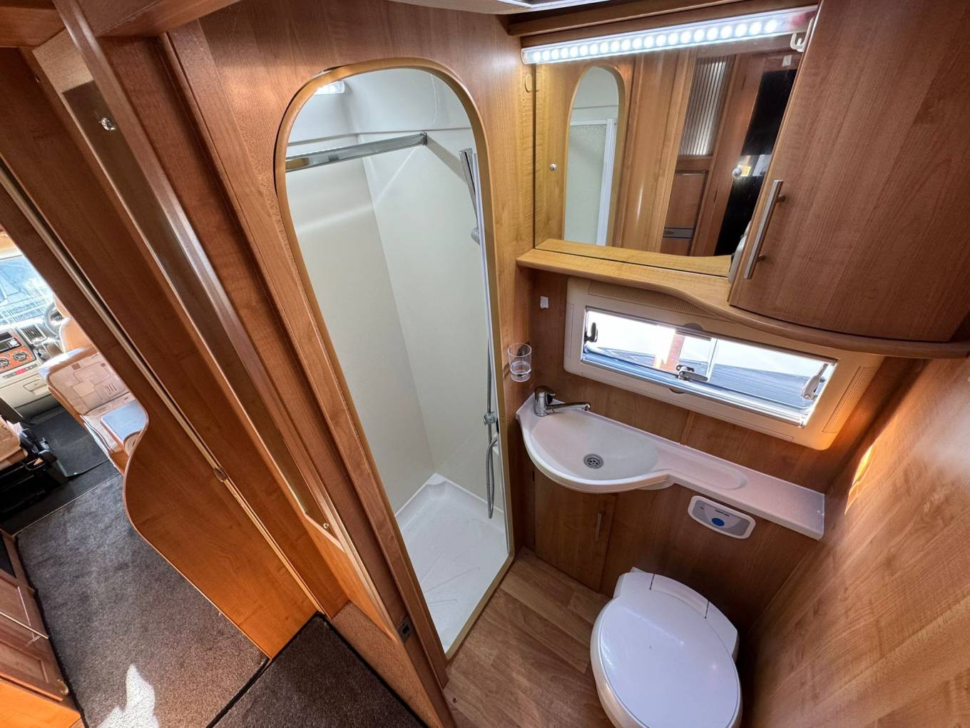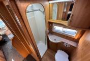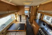 The motorhome also features a fully equipped washroom, with a sink, toilet, and shower, ensuring that all your daily needs are met while on the road. The swivel seats in the cab provide extra flexibility for the driver and passenger, offering better comfort during both travel and when the vehicle is stationary.