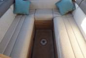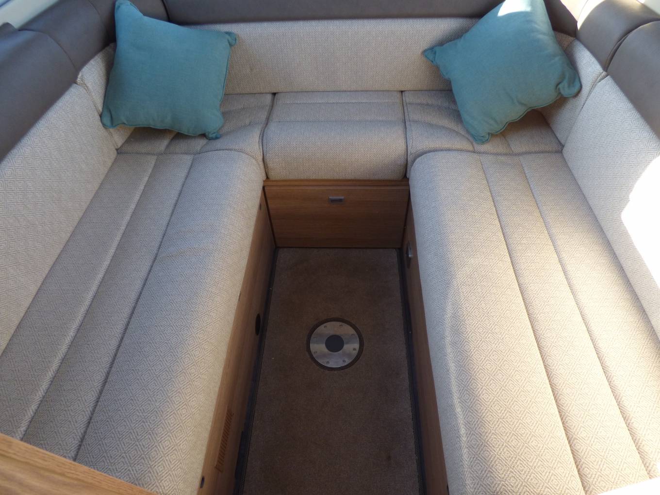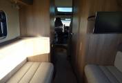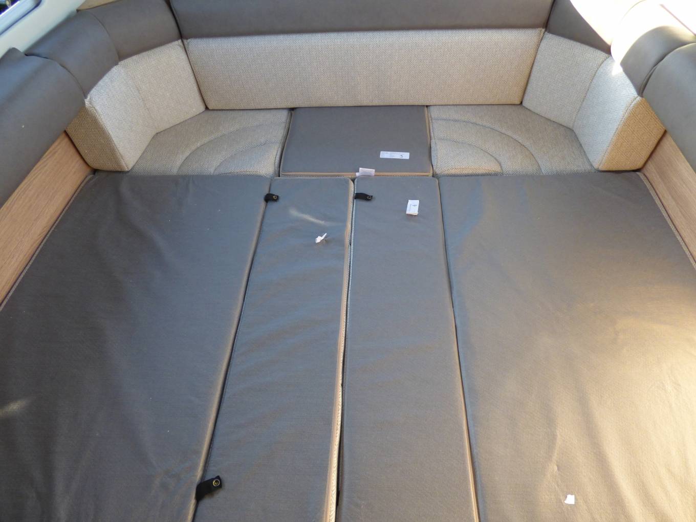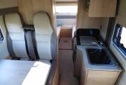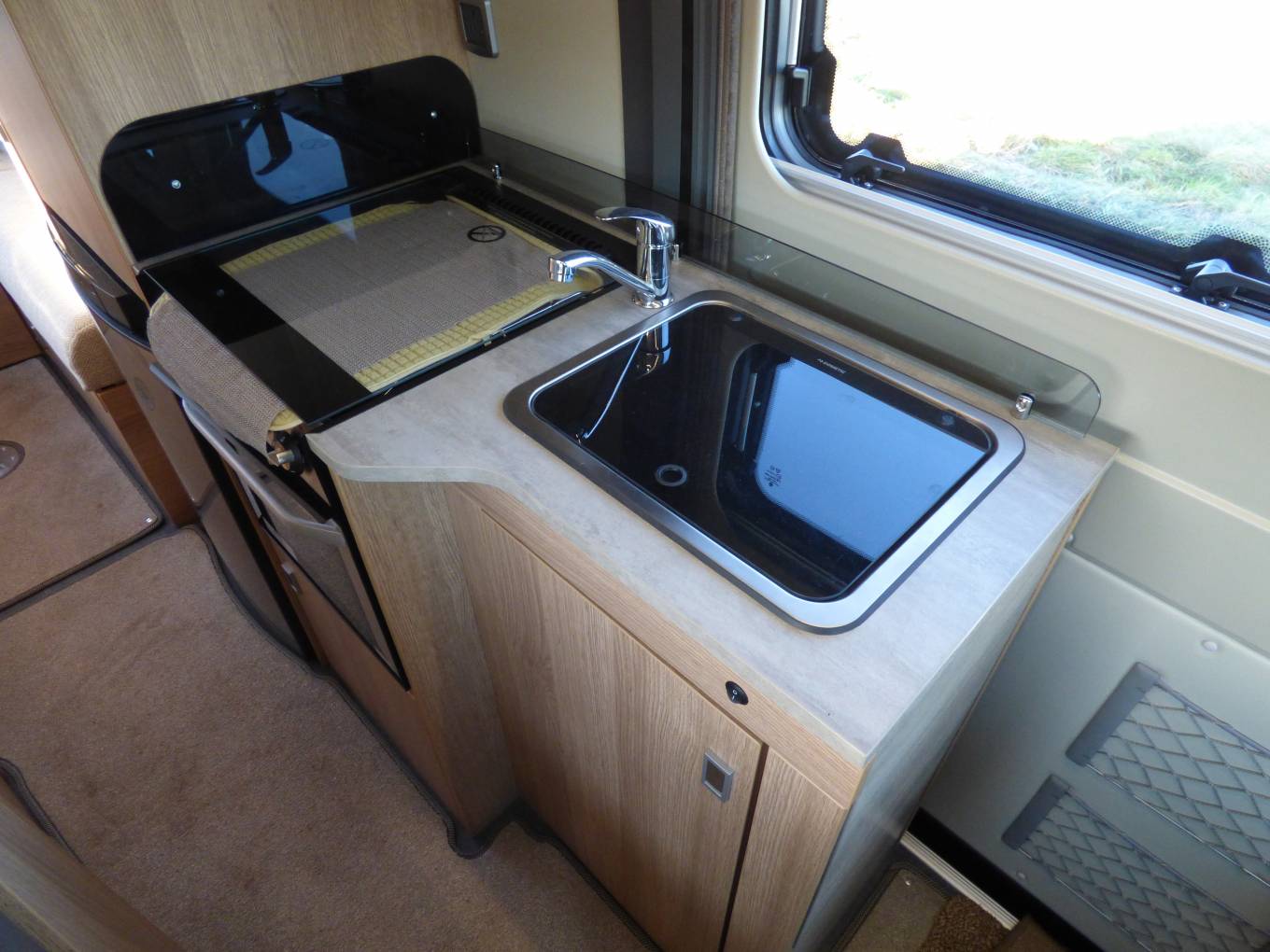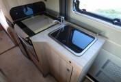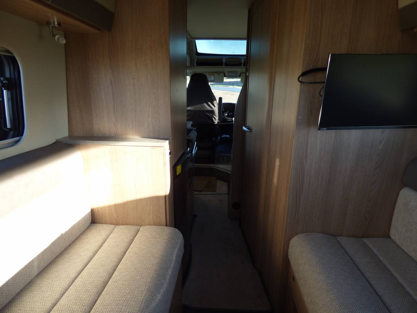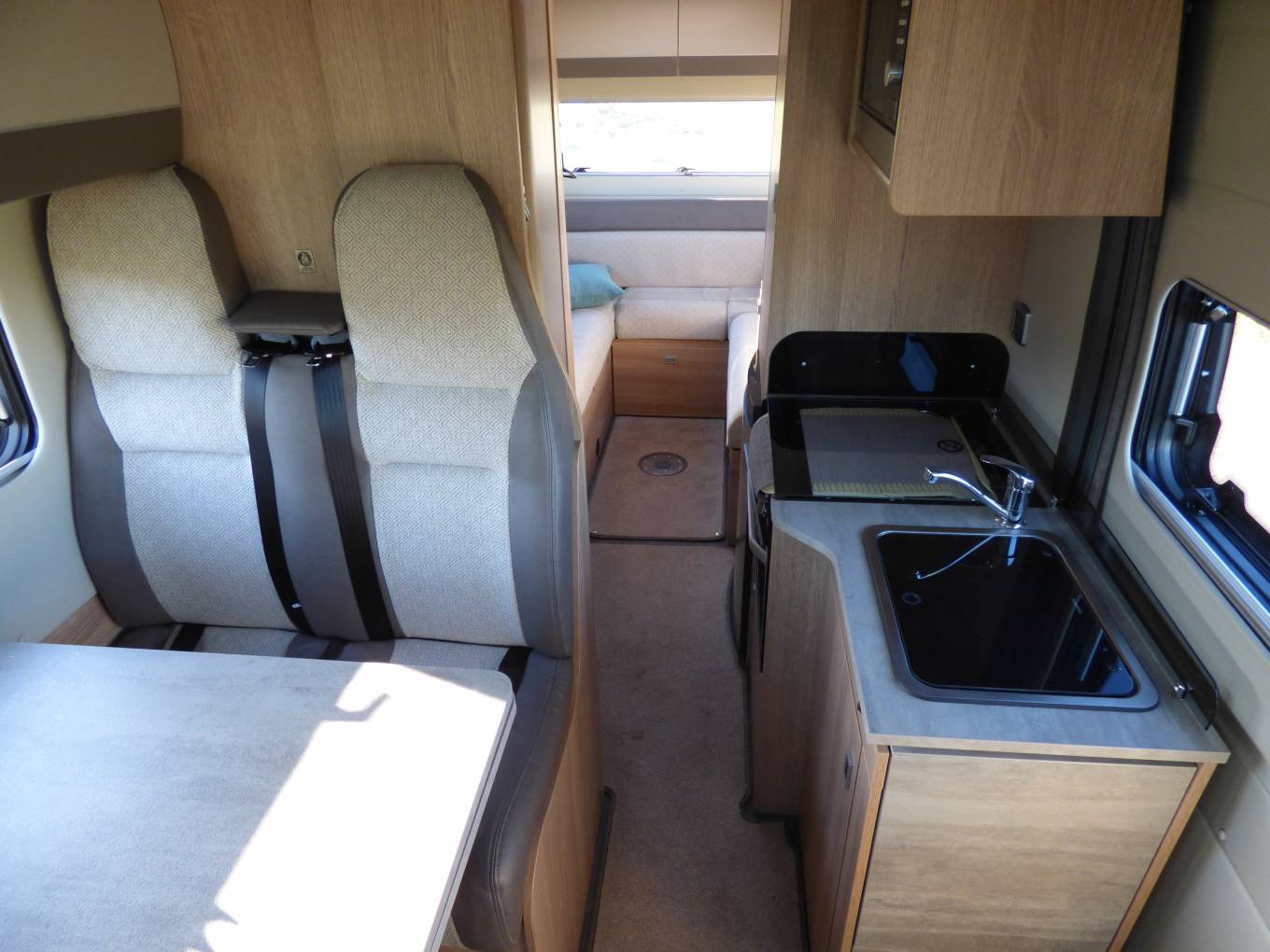 The interior is very light and airy with 2 Heki rooflights, panoramic windows in the ever popular rear U shaped lounge and along the nearside sliding door. The rear lounge accommodates a fold away table for the social side of things and the two side benches quickly convert to a large double bed. The digital television is in this area.