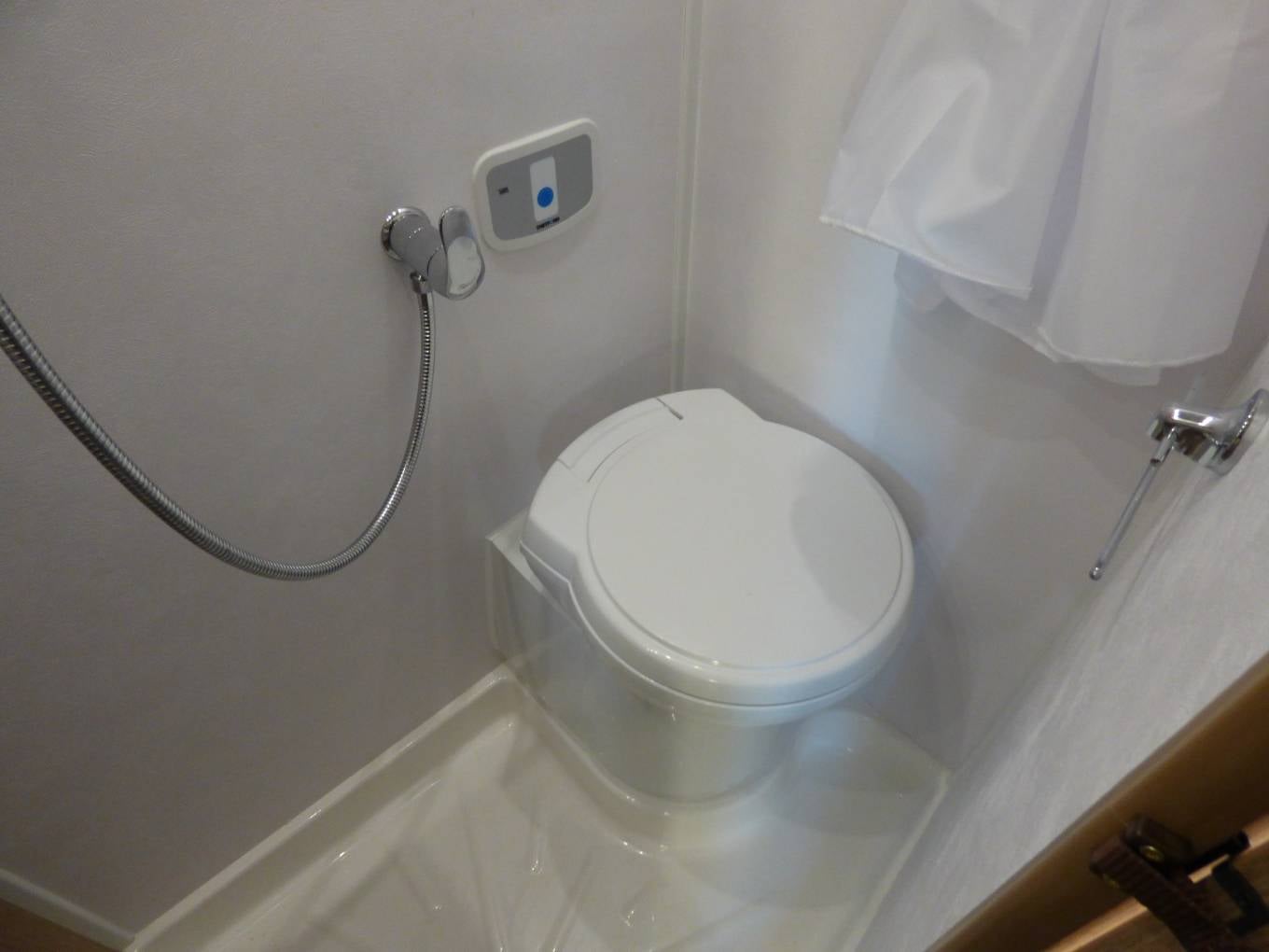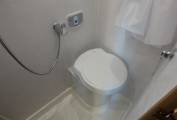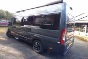 In the middle of the van can be found a decent size wardrobe with hanging rail over a fridge with freezer box and next to a microwave, hob and oven with grill. With Whale gas and electric heating the vehicle has an underslung refillable LPG tank. Opposite the kitchen area is a sizeable washroom with full height shower, mirrored vanity unit, fold down sink and Thetford w.c. The front dinette has the two extra seatbelts and the driver passenger "Captain" style seats swivel to face an extending table and thus a comfortable area for 4 people.