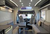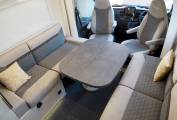 Inside, you will find a roomy dinette with twin side settees, multiposition table and swivel cab seats, up to 6 can sit here for a social. This model features two pop up travelling seats in the dinette, each with a 3 point seatbelt. additional cushions for these seats are present and unused in this one owner motorhome, currently used as a two berth.