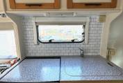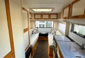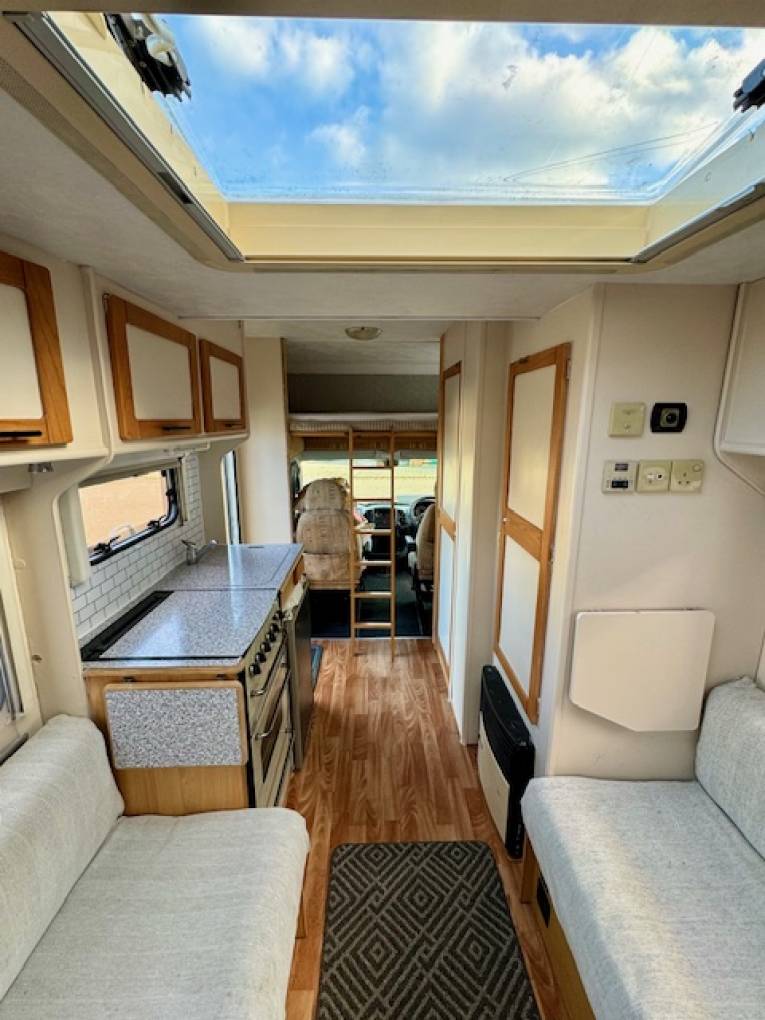 This is a 4 berth model with a U shaped lounge at the rear which gives plenty of space for entertaining and converts to a large double bed for a good nights sleep. The kitchen area has all the mod cons to be expected including, oven hob and grill, fridge with freezer compartment and plenty of storage. There is also a sink and drainer. At the front of the vehicle is the overhead cab double bed which can be left made up ready use of an evening.