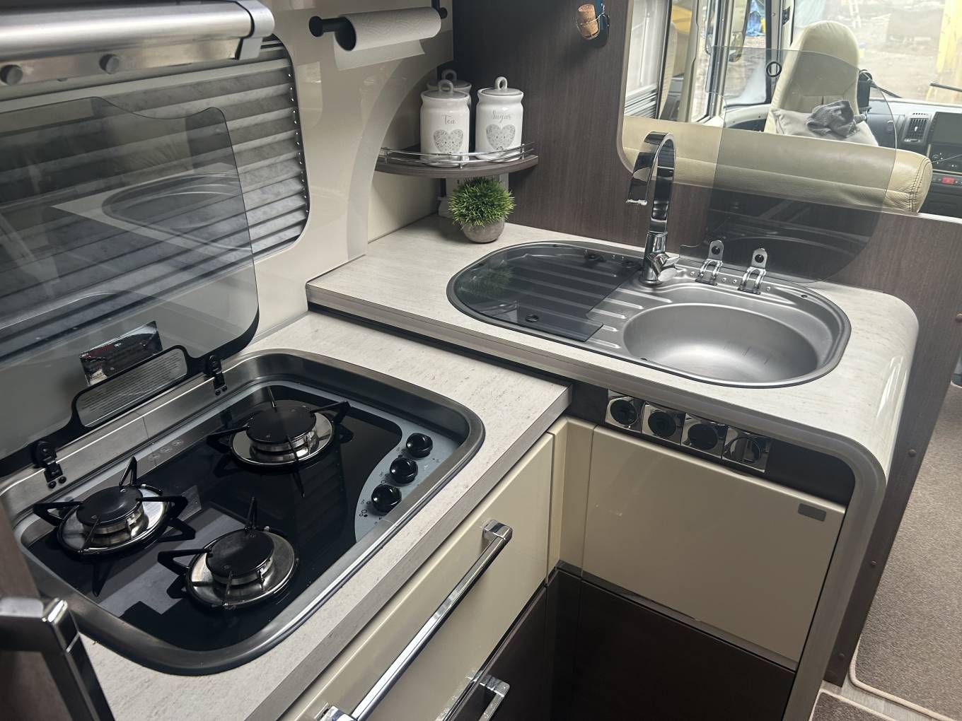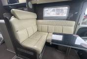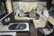 As mentioned, this Grand Panorama has an excellent layout and is a wonderful motorhome that provides all the home comforts you could wish for. At the front you have a spacious lounge area that is made up from the two Captains Chairs, an L-shaped sofa and a further small double seat that makes a great place to sit and relax. The amazing front windscreen gives you wonderful views and lets so much natural light in. The current owners have replaced the original table with a smaller coffee style table - but do have the original which can easily be put back. Moving back the motorhome has a well equipped kitchen, This comes with a gas hob with 3 burners, microwave oven, sink with mixer tap, lots of cupboard and storage space and a fridge with separate freezer operating off 240 mains and 12 volt.