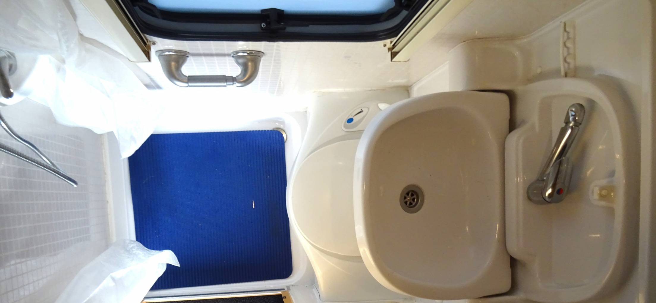 elements including toilet with vanity sink and shower. Behind the double passenger