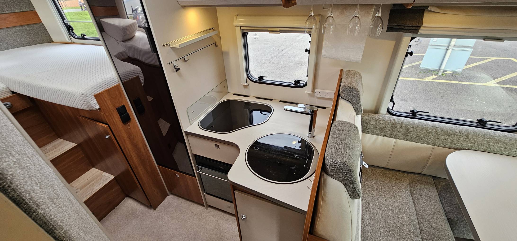 Large fixed rear bed area above garage either as twin singles or very large double with additional cushions