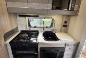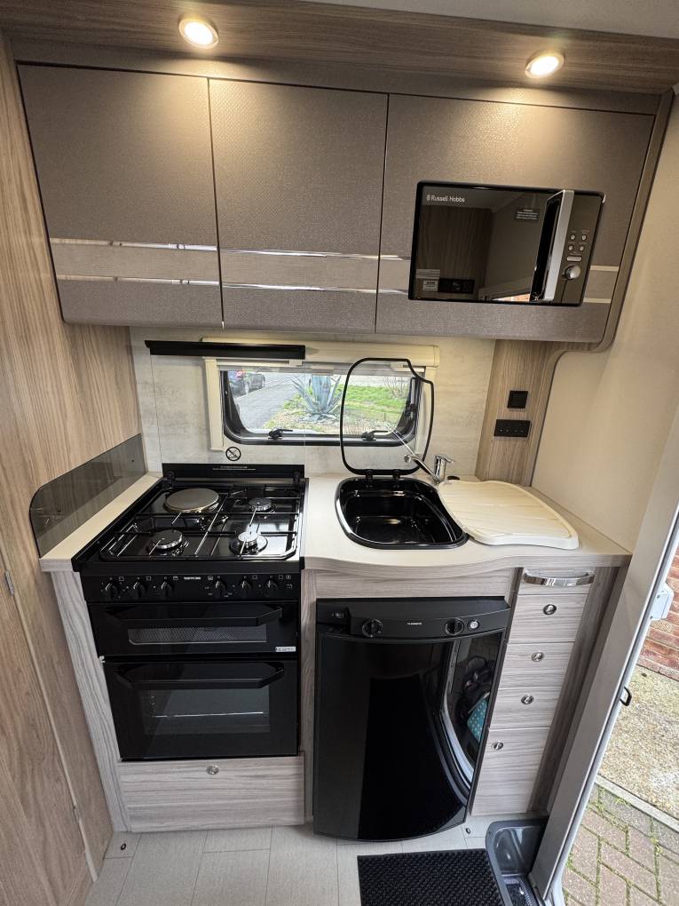 We enter the motorhome from the near side rear via a low step, the kitchen is immediately on your right hand side, with a large black rectangular kitchen sink with chrome mixer tap above it has a glass lid to close and a plastic draining board is included. 3 gas burner hob with a full size oven & grill beneath. Also under the counter is a Dometic 3-way fridge with removeable freezer box that can be powered by 240v,12v or gas depending whether you are plugged in on site or wild camping. There are plenty of cabinets, cupboards and drawers to store away your holiday provisions.