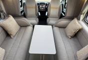 Moving forward is the lounge area which has two opposing 2 seater sofas that easily convert to a large double bed or turn the cab seats around and have two long single beds. A sunroof above floods the lounge with natural daylight, there are upper aircraft style storage cabinets and a good sized folding dining table is provided that stowes away in the wardrobe when not in use.