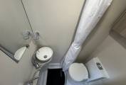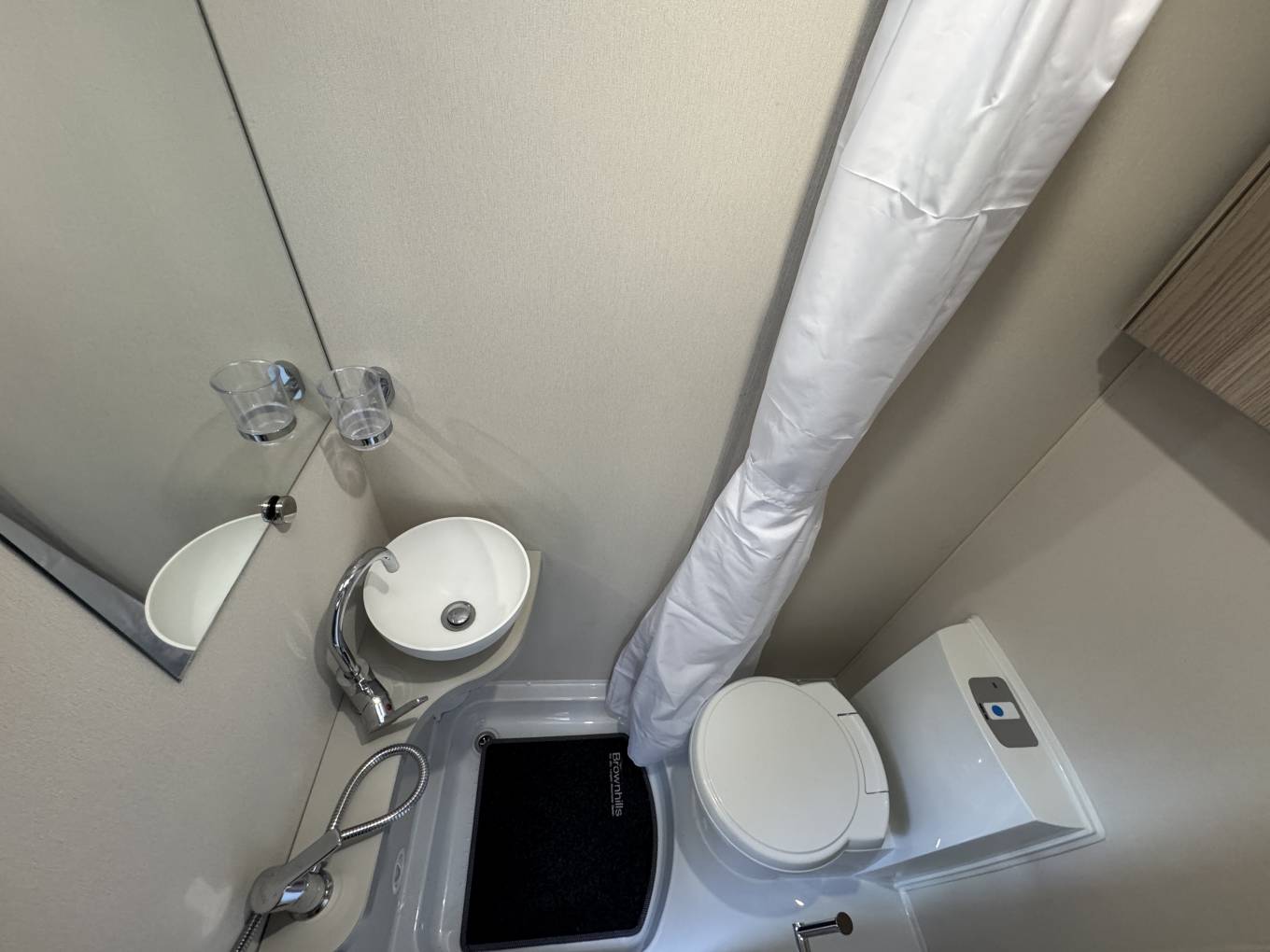Next to the kitchen is the washroom has a Thetford cassette style swivelling head toilet with electric fresh water flush, a designer round wash hand basin with swan necked designer chrome mixer tap. A good sized shower curtain and separate tap to control the shower handset, which is fitted to a rising rail. A good sized wardrobe is provided with hanging rail next to the bathroom.