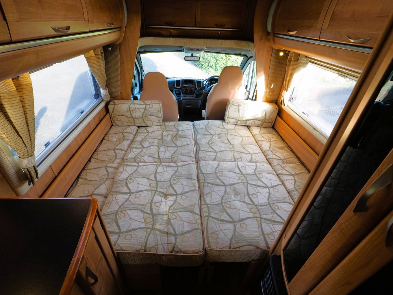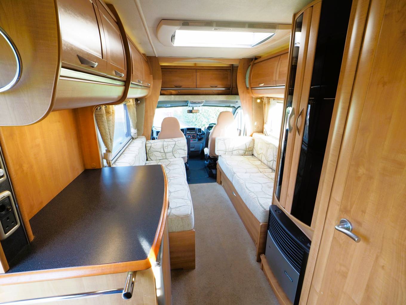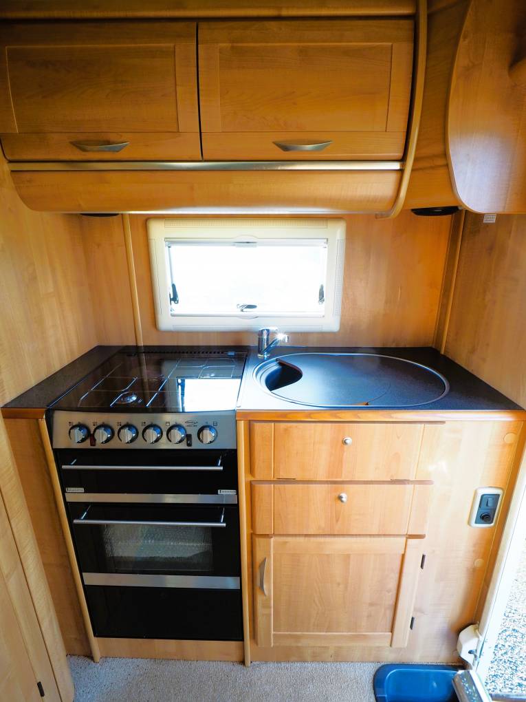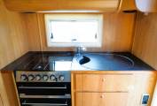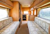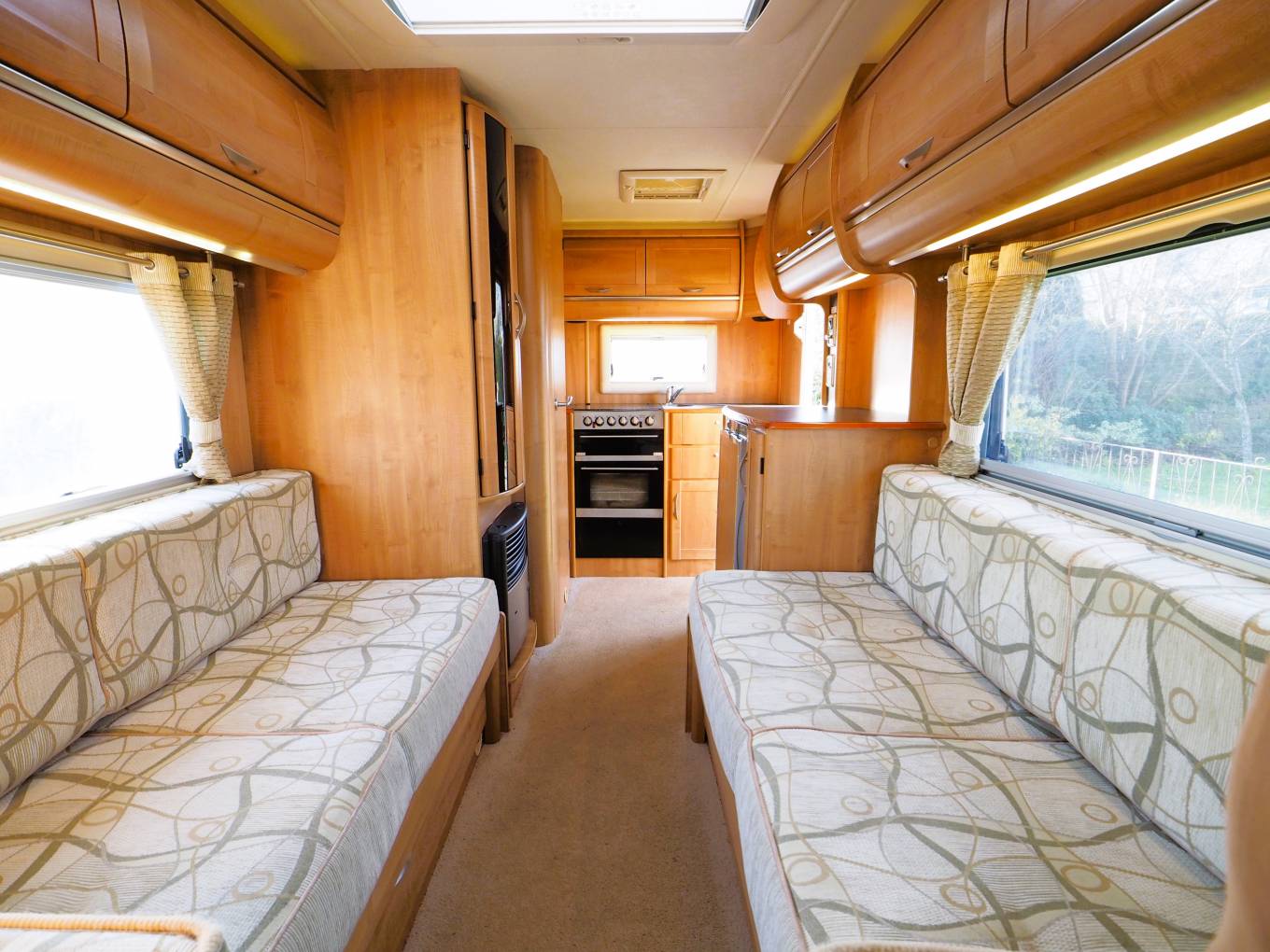 The lounge comprises of two long side sofas that can extend for use as two single beds or pull across to create a large double sleeping space. A drop in table makes this area a relaxing place to dine or entertain. Plenty of storage under the sofas or in the overhead lockers that run to three sides. The kitchen is well equipped with a full oven and separate grill with 3 burner gas hob and an electric hotplate. There is a sink with mixer tap and an under counter 3-way fridge with freezer box and plenty of storage. A private washroom provides a flushing cassette toilet, sink with vanity mirror and storage and a separate shower cubicle.