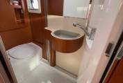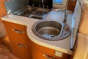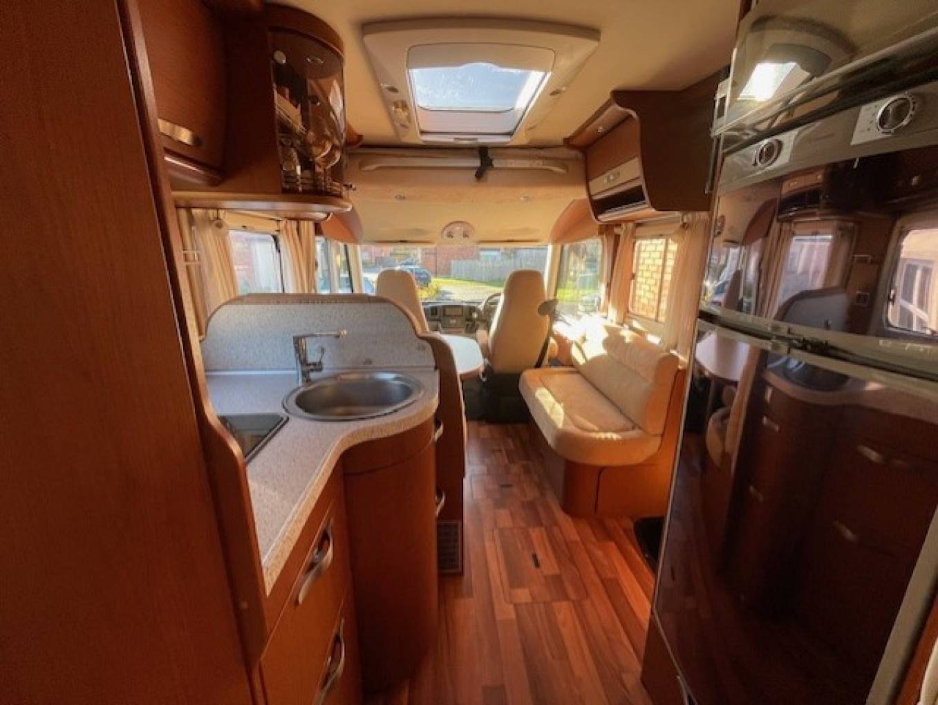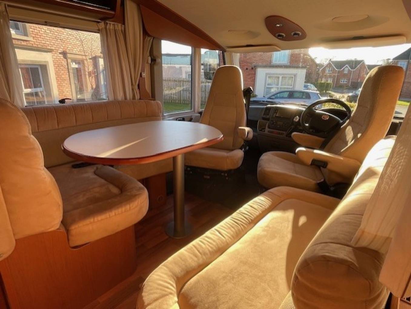 Lounge/dining space has a spacious L shaped seating area with a side facing sofa. 2 travelling seatbelts appointed here and the dining table is adjustable. Both Captain's chairs will swivel round to create more space for relaxing and dining.