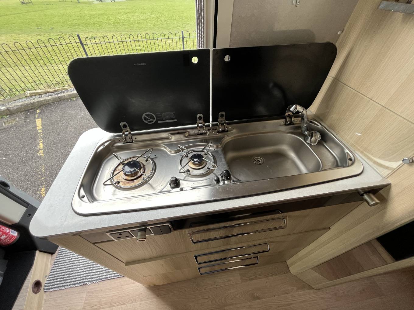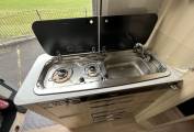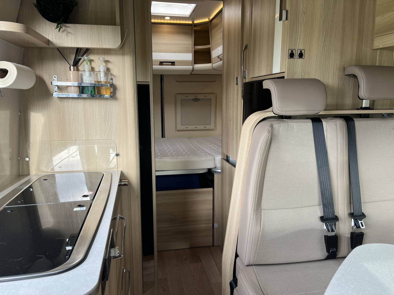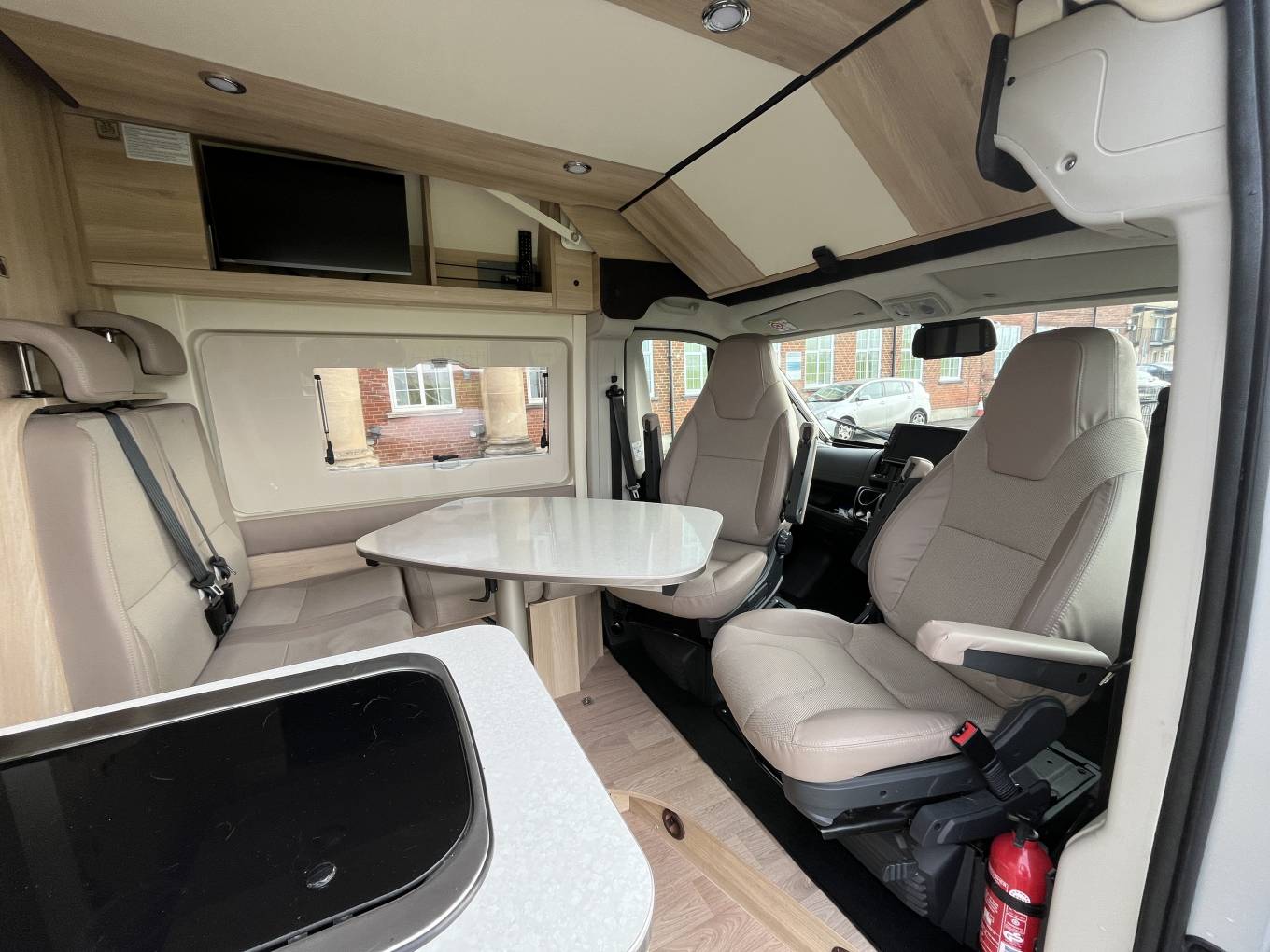 Inside, you’ll find a fully equipped kitchen inc. Gas Hob, Microwave and large fridge freezer, generous storage, a roomy washroom with a shower, and Truma heating to keep you cozy year-round. The lounge area sits 4 people comfortably by utilising the Captains Chairs as sit you sit back to chat or watch TV. Every inch is thoughtfully crafted for maximum usability without sacrificing style. With high-quality fixtures and finishes, it’s more than just a camper, it’s a true home on wheels.