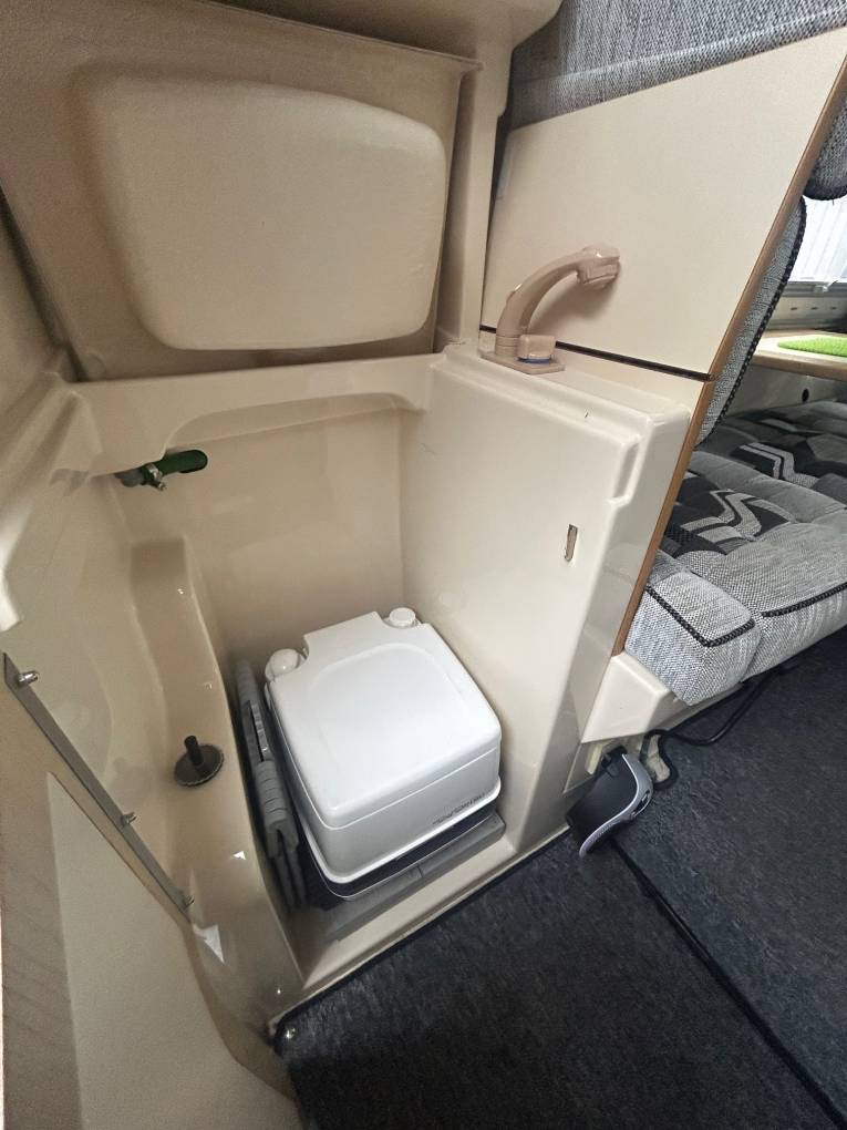The kitchen is fully equipped with a 2 burner gas hob, grill, sink and a fridge/freezer with a good work space and plenty of storage cupboards. A porta potty in its own cubicle is present.