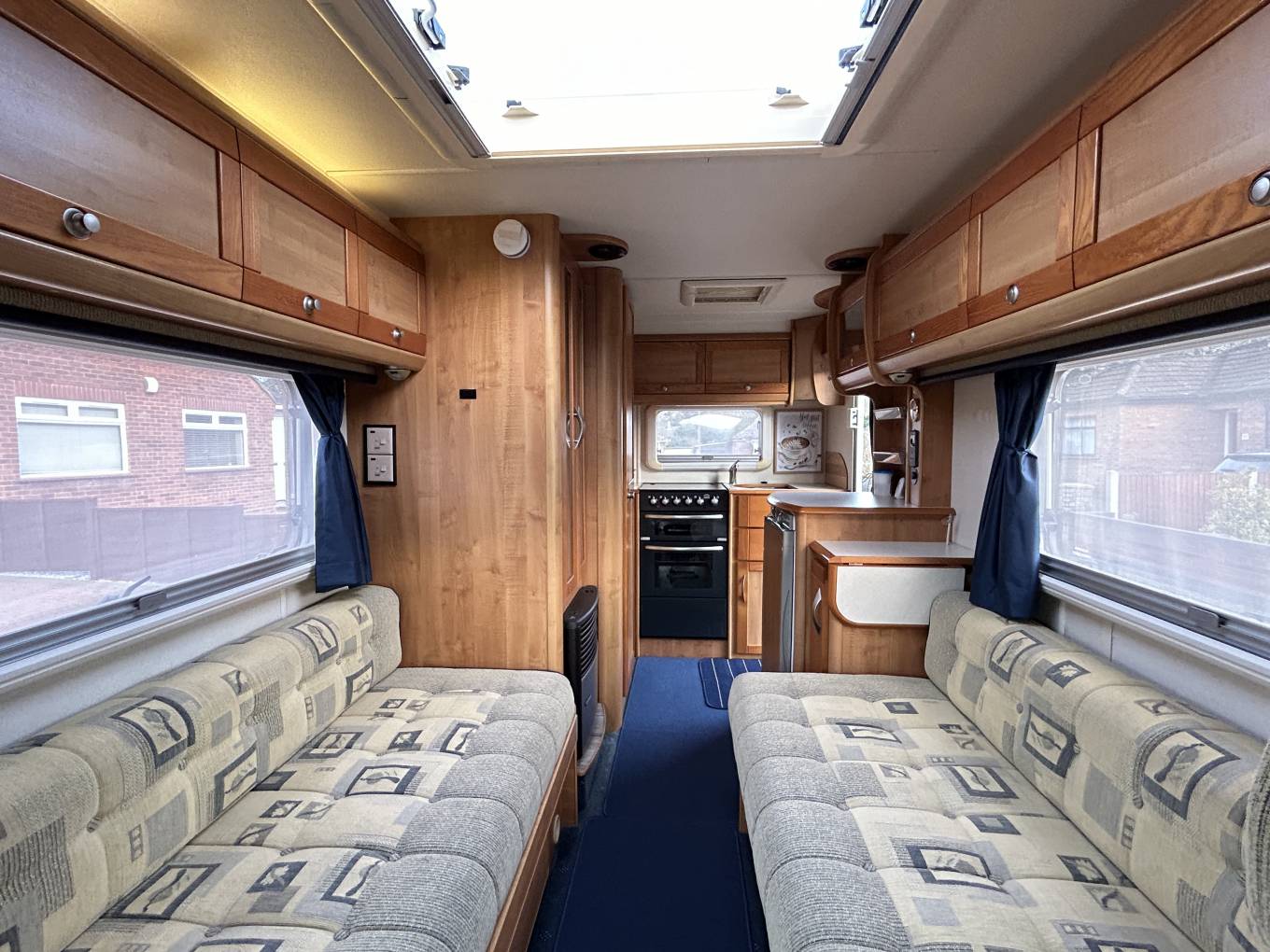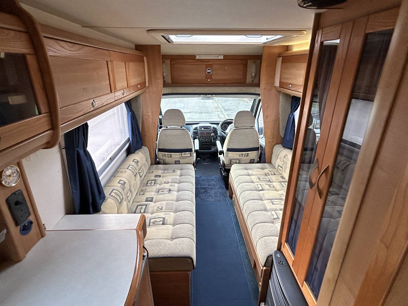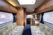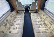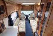 Internally the motorhome has been kept in superb condition and it is a real credit to the current owner. Nowhere is this more evident than in the stunning lounge which is possibly the standout feature of this lovely motorhome. Here you have two long side facing sofas finished in a stylish hard wearing fabric. Spin the 2 front swivel seats around and both sofas can be used as single beds, or alternatively they can be pulled together to create a large double bed. At meal times there is a freestanding dining table that can be used and when you have finished your meal the table stores away neatly in a cupboard freeing up your lounge.