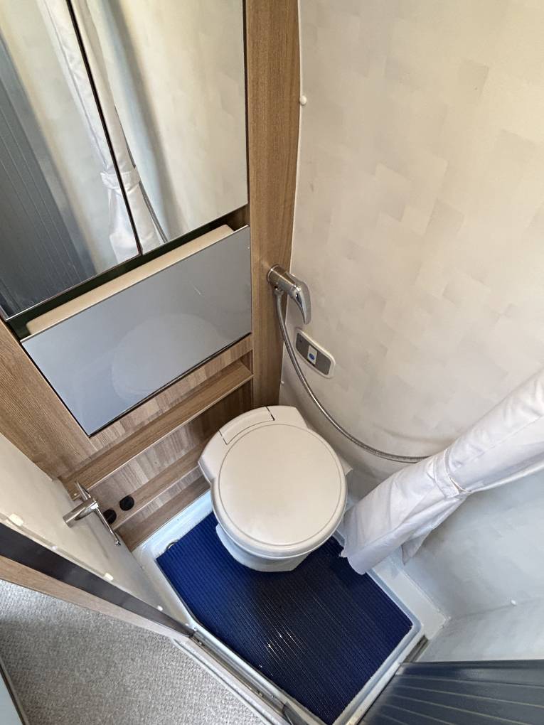 The washroom has a shower, a Thetford cassette toilet with electric flush, a fold away sink with a mixer tap and a mirrored bathroom cabinet so you will have no trouble keeping fresh on your adventures.