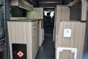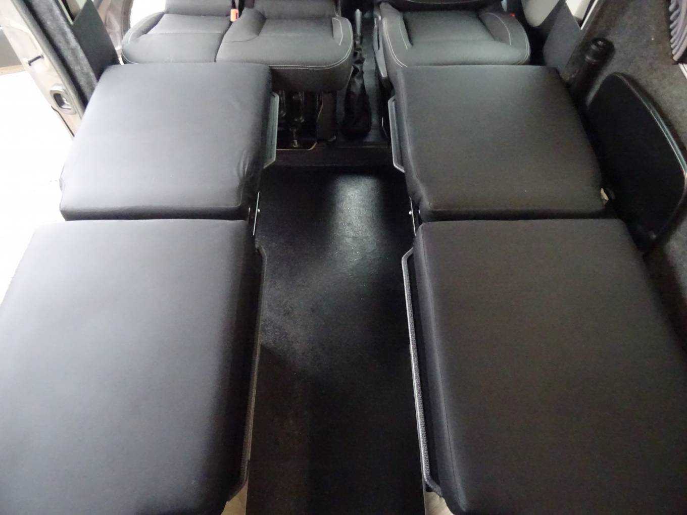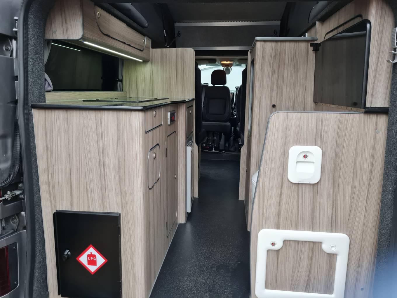 This is the nicely designed and very well built C C Campers Witley. It is a great camper and/or day van. The reverse Pop top allows more cabin space at the back in the well equipped kitchen area. There is a 2 gas hob burner, 12v Fridge, sink, tap, and very good all round storage. At the very rear is a flushable Thetford cassette toilet. This design has rear barn doors.