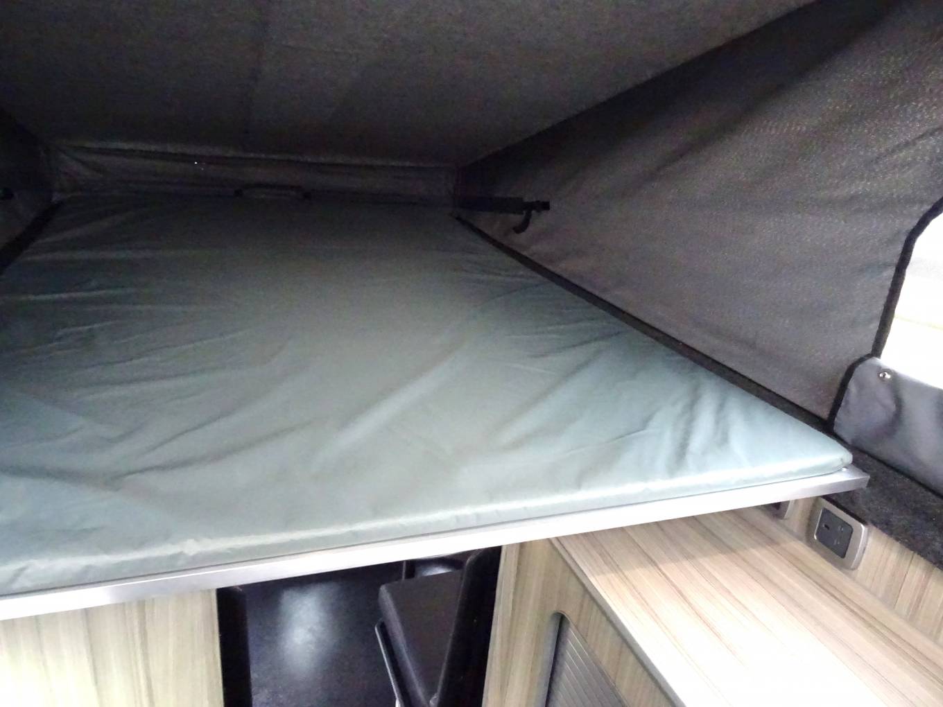 The mid section offers excellent travel and leisure comfort with separate belted seats (with under storage) and a table station. The cab seats both swivel and the passenger seat is a double, this lifts up and there storage underneath. The two rear single seats easily slide forward and fold down to make 2 single 6ft long beds and also leave easy access to the rear, alternatively a full double can be set up. The Pop Top will sleep 2 and has a rear window and side fly screens. There are black out curtains and 240v hook up.