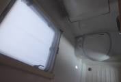 At the front of the habitation, opposite the door, is the offside washroom, with toilet, a hand basin, and shower.