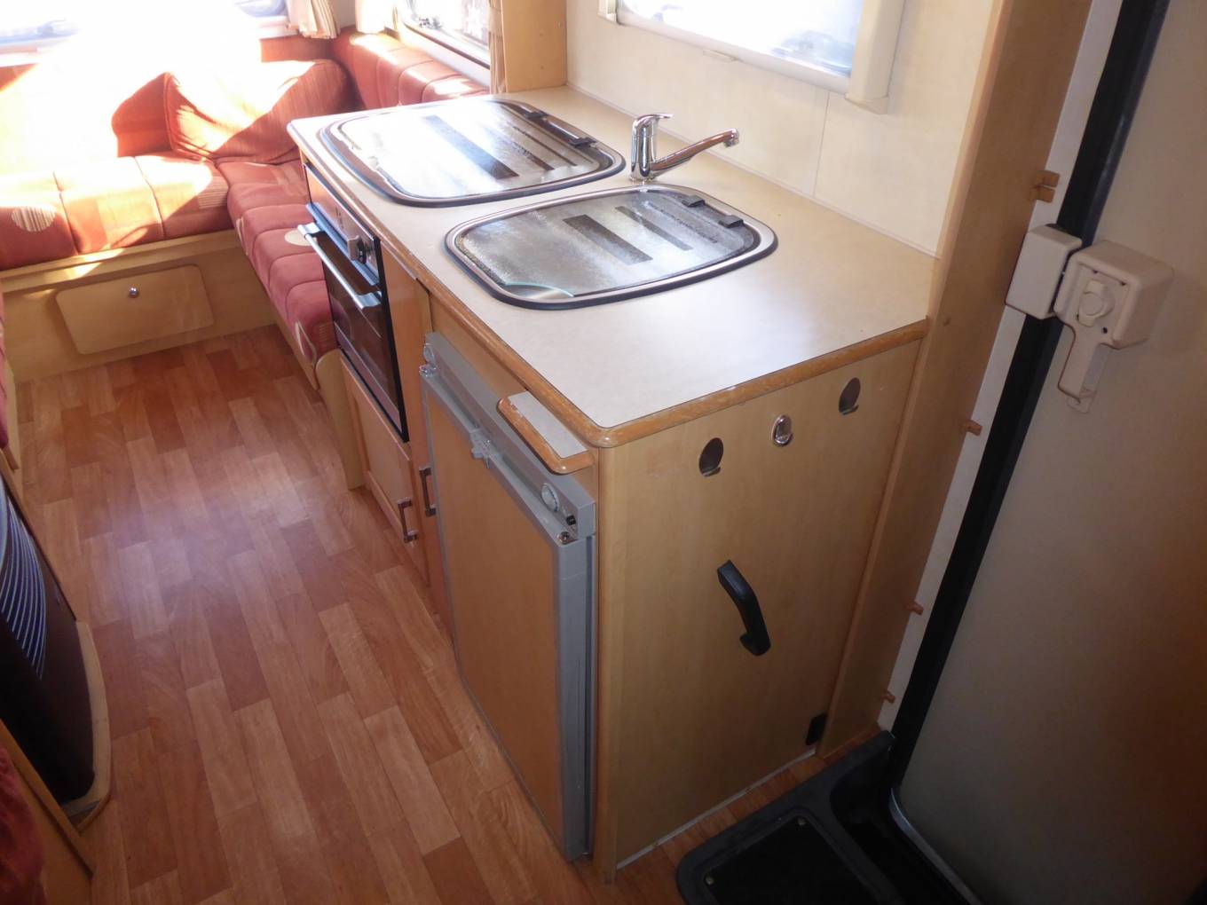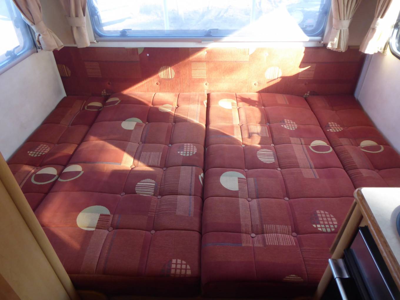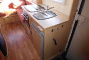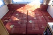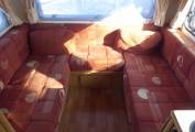 At the rear of the vehicle is a U-shaped lounge with large windows on three sides that allow plenty of light in. There is plenty of storage under the seats and overhead. The seating can be easily converted in to a transverse double bed.