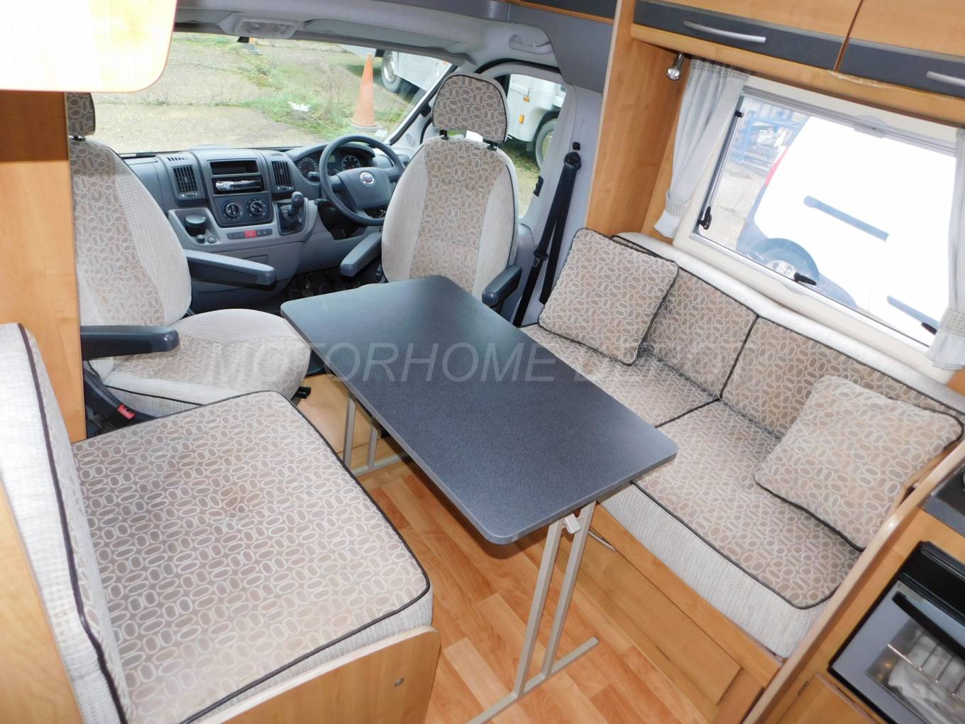 swivel to face hab area, large folding dining table, windows & sunroof