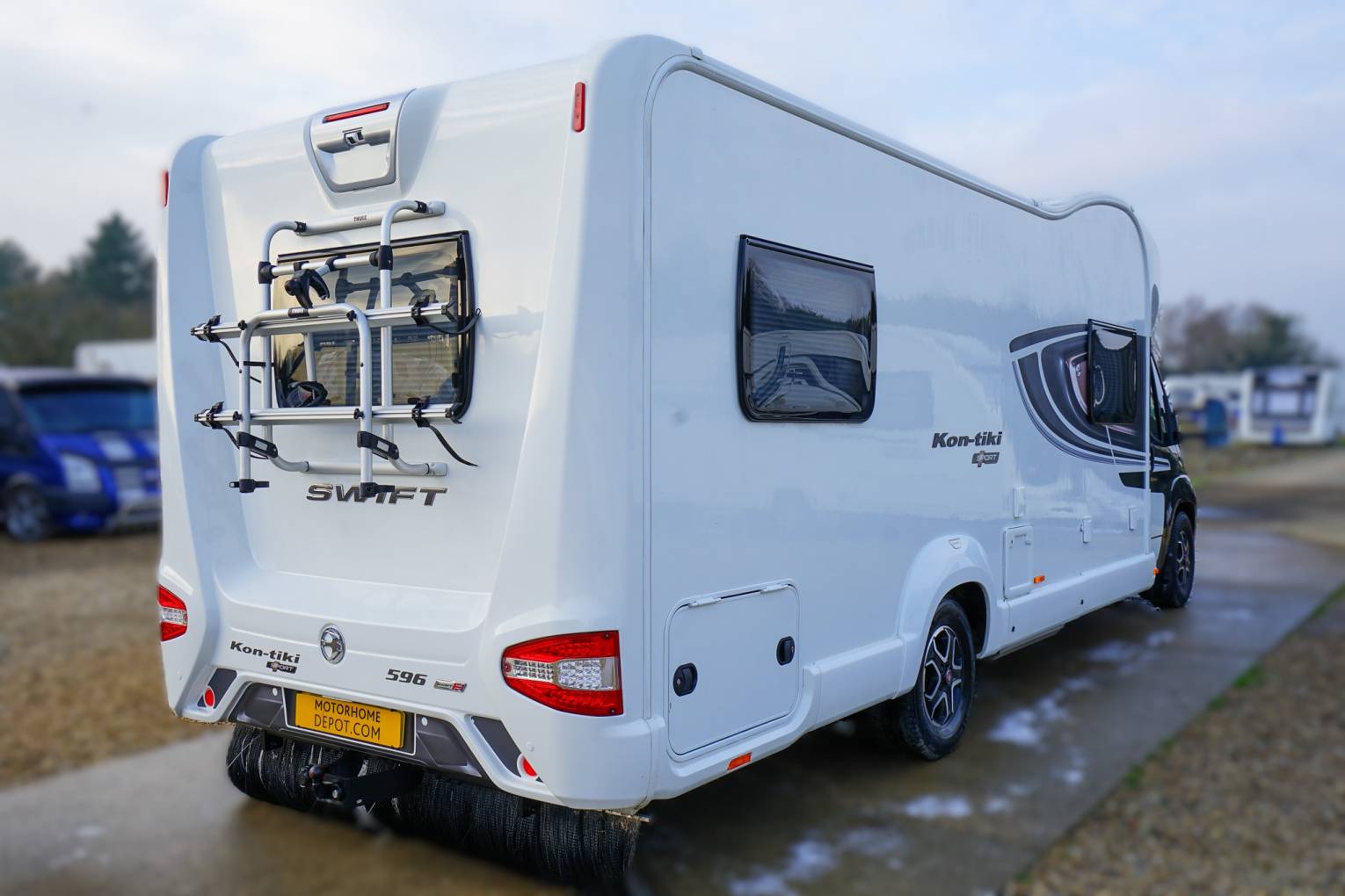 2021 Swift Kon-Tiki 596 Sport – 140 Bhp, 9 Speed Automatic Only 5,873 miles. Spacious layout with Forward & aft Living areas, Electric Drop Down Bed and Super comfortable U shaped rear Lounge. Fitted with Amplo Automatic Self Levelling System, Reverse Camera, Gas-Low Refillable Gas system, ALDE heating, Tow Bar, Bike Rack, Awning, External BBQ & Shower Points, Alloy Wheels, DAB Radio, Remis Cab Blinds, Cab Air and Security Tracker.