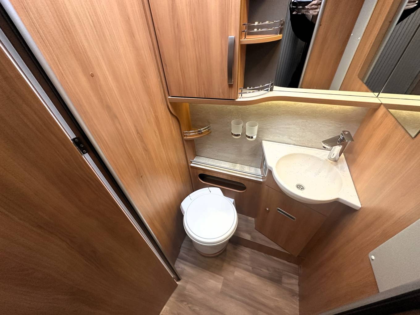 of a Thetford cassette toilet, vanity hand wash basin and wall cabinet.