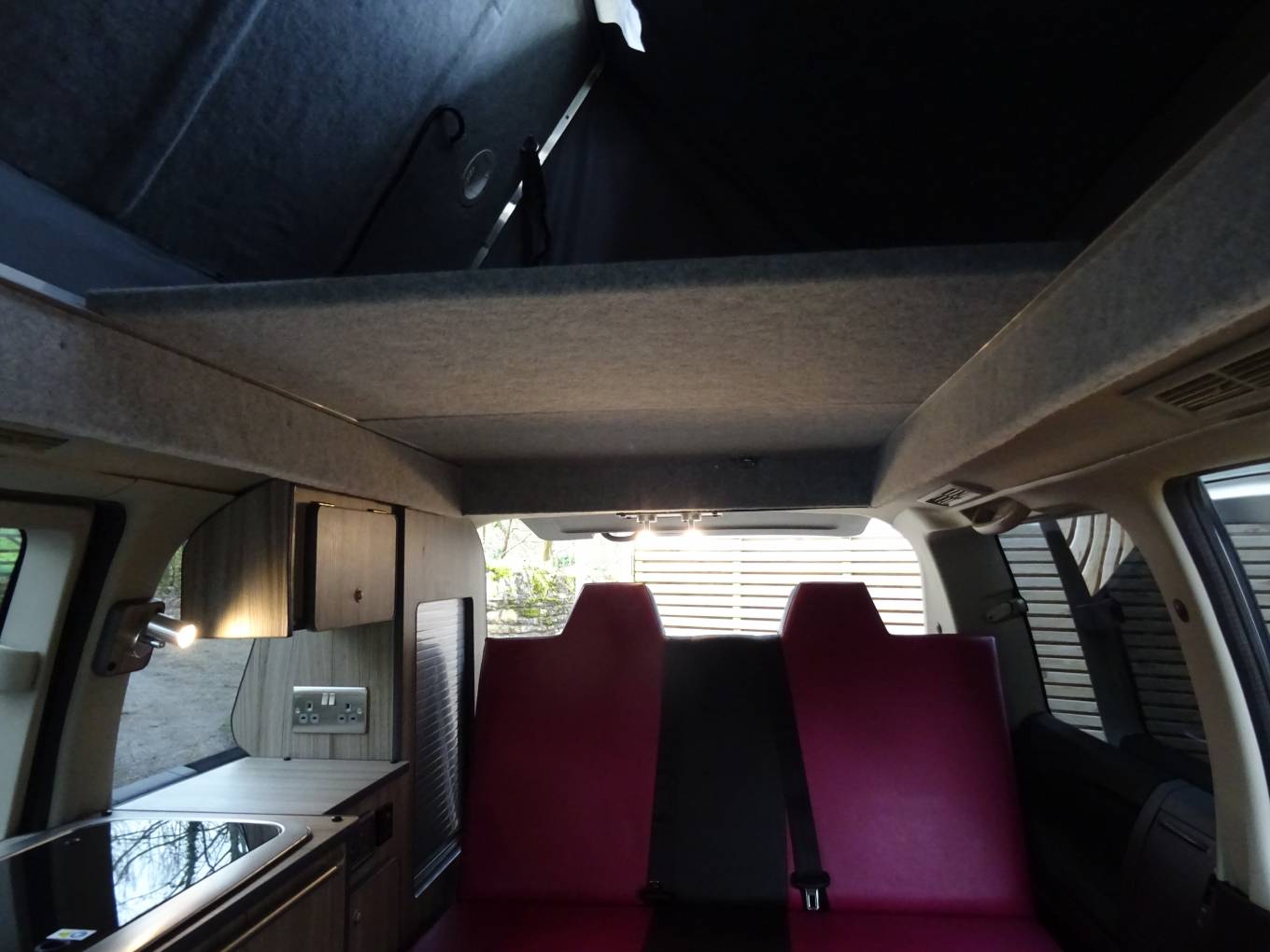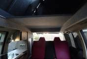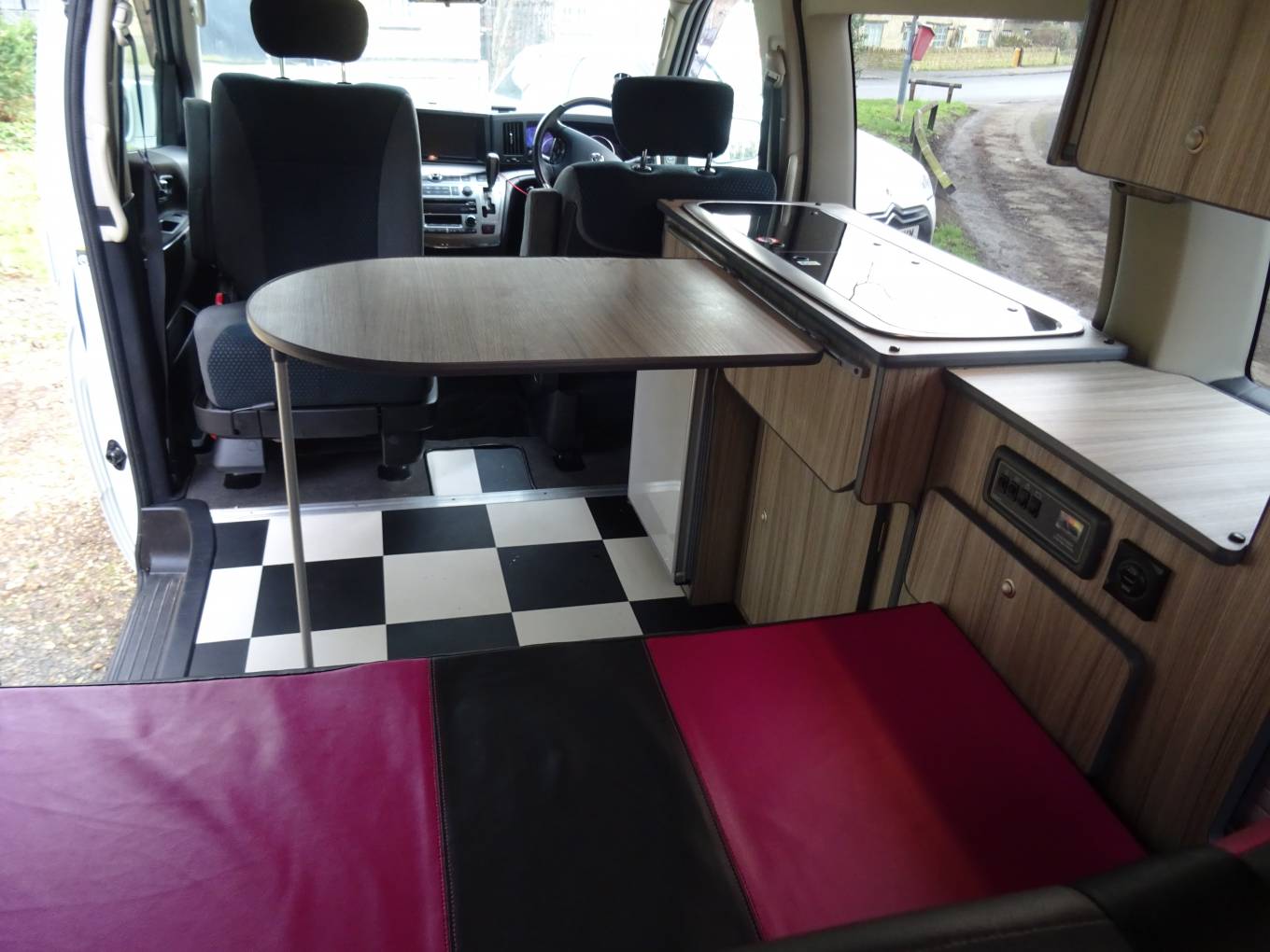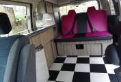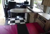 The passenger seat swivels for a comfortable lounge and there is a fold away table for dining. We have a 2 burner hob, stainless steel sink and cold water tap, 12v fridge and a reasonable amount of storage.