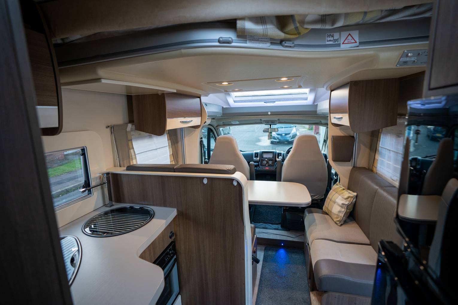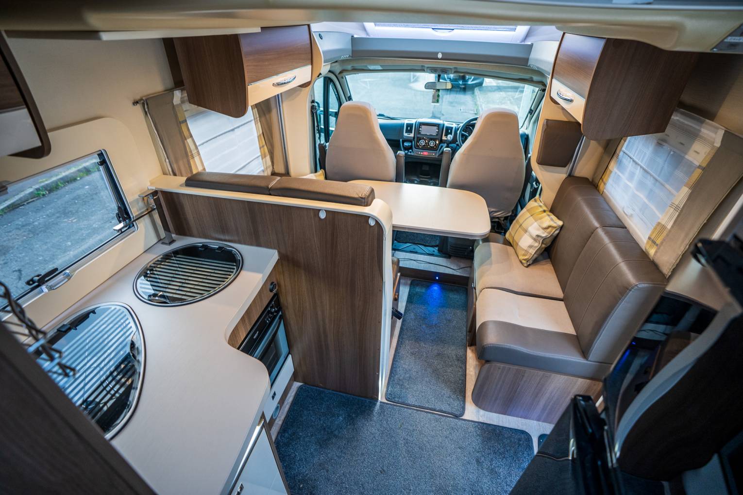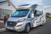 This vehicle really is one of a kind. From the moment you see it you can tell its a vehicle that has been meticulously looked after and intelligently designed. It's compact length and low profile construction make this a joy to drive, but as soon as you get inside you can tell there have been no compromises on luxury and space. The lounge area features stylish two-tone comfortable seating, and a centre dinette table, whilst the two captains chairs - swivel round to make dining with the whole family a pleasant and enjoyable experience. The Kitchen Area features a 3 gas burner Thetford hob, Duplex Oven/Grill and a full sized 3-way fridge with separate freezer, alongside ample storage and worktop space. The bathroom features a large shower area with retractable divider door, vanity sink, mirror and thetford toilet, whilst the entire vehicle is lit up with stunning lighting and luxurious 'cool blue' LED Lighting.