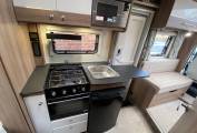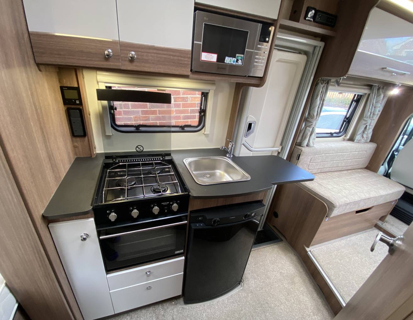 comes with a Thetford oven, a three-burner gas hob, a microwave, and a
