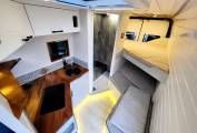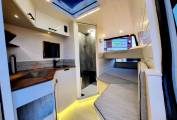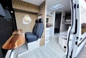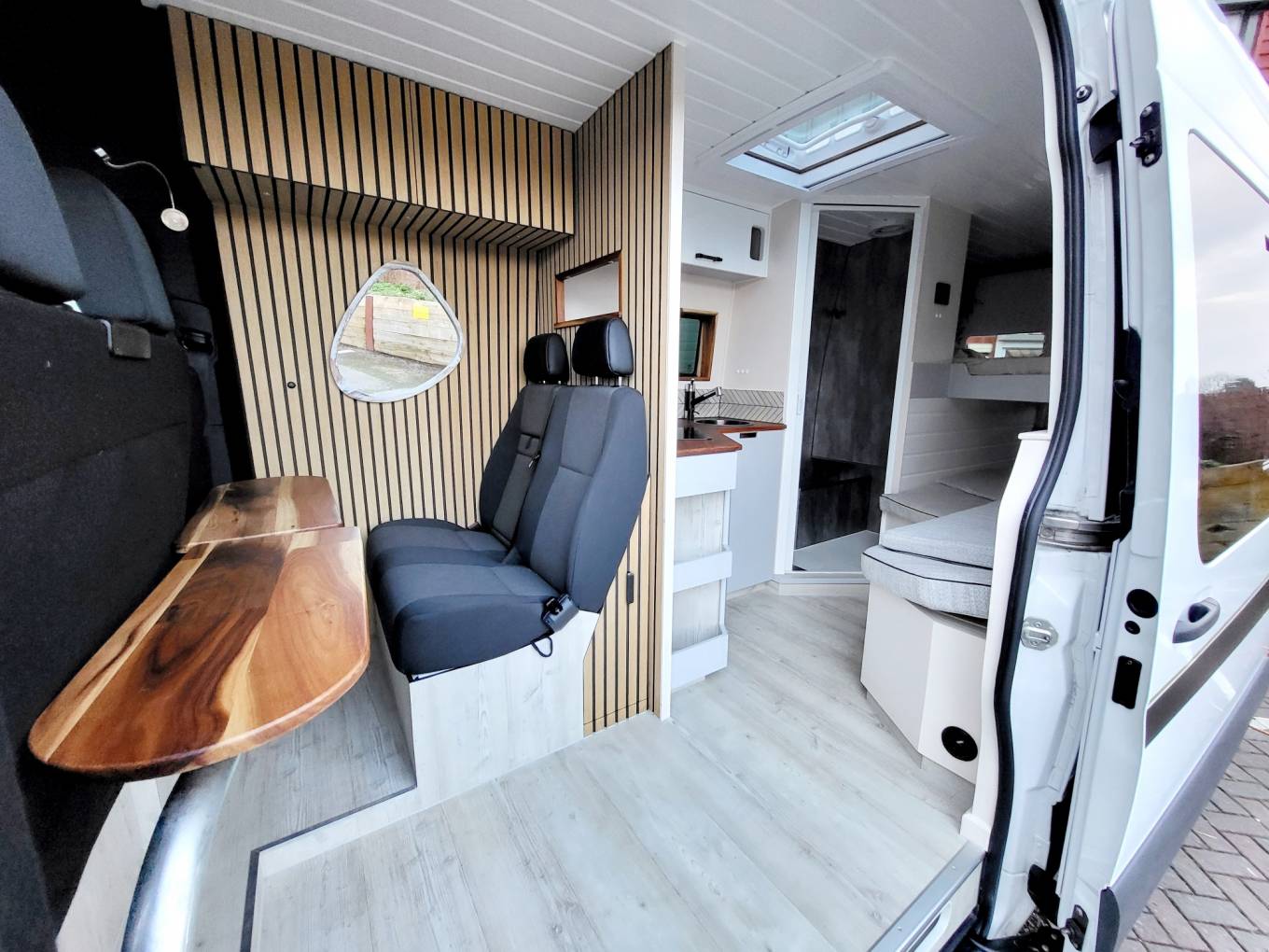 Front seating with belts for 5 and 2 unusual swivel tables offering dining for the family and a spacious and very clever kitchen area.