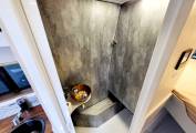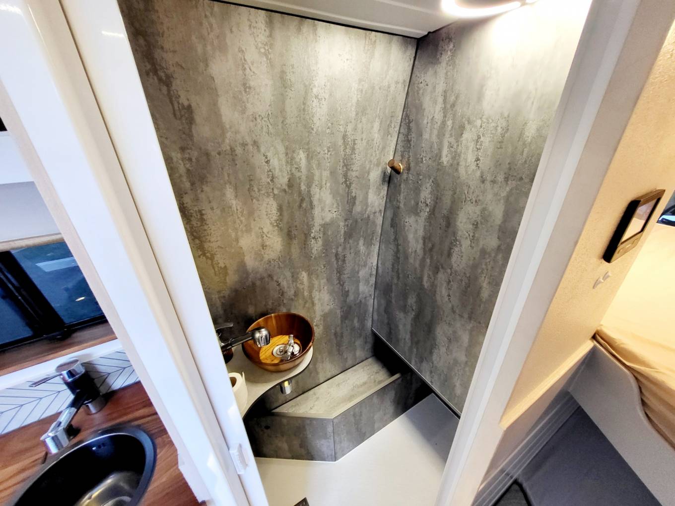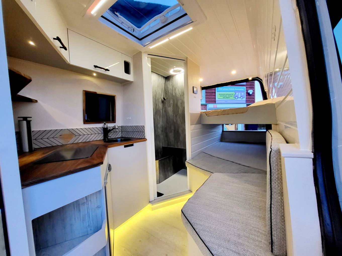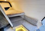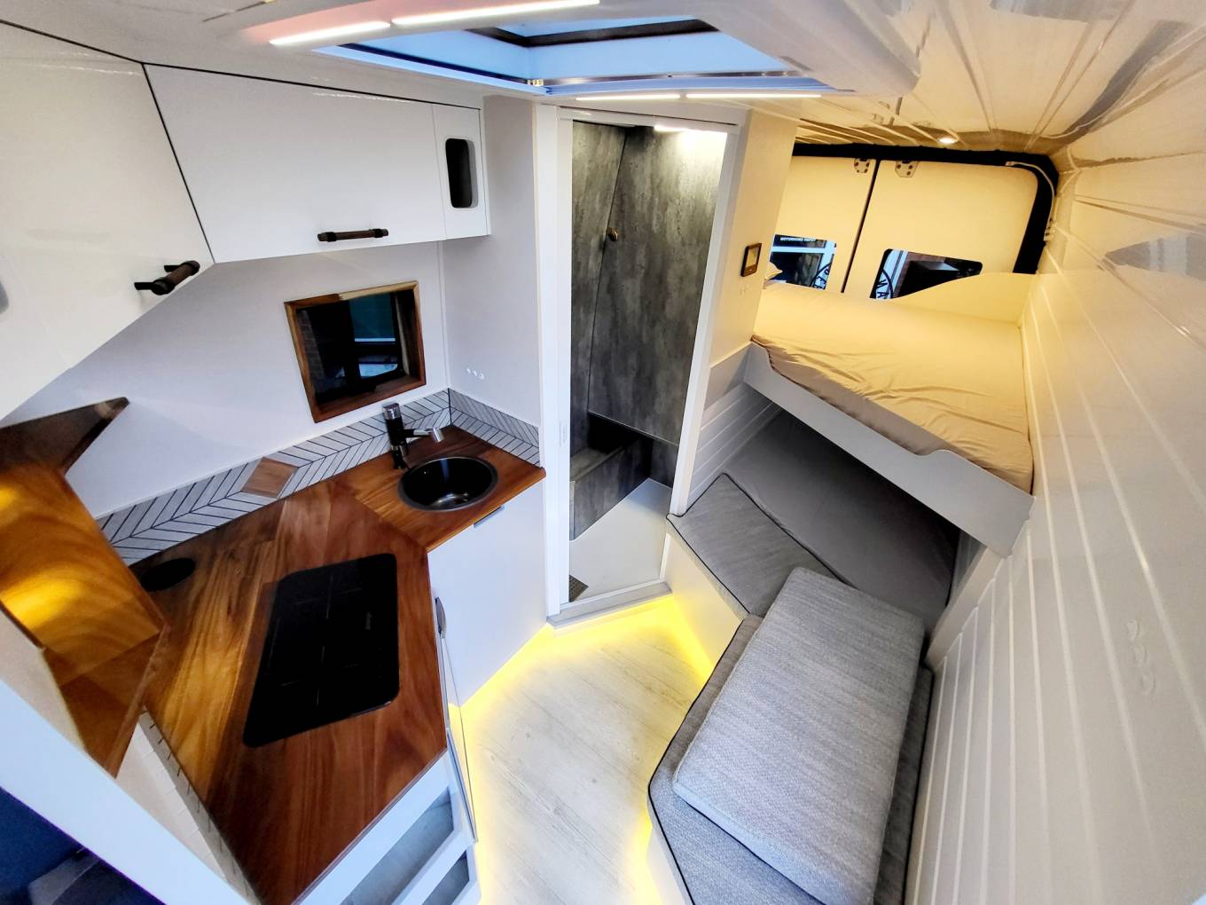 Bunked double and large single bed above small garage at the rear provide sleeping for a family. Small bathroom with shower and sink with space for a porta potti. There is also a hot/cold shower located in the garage area of the van.