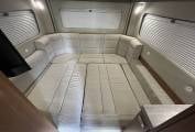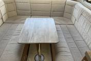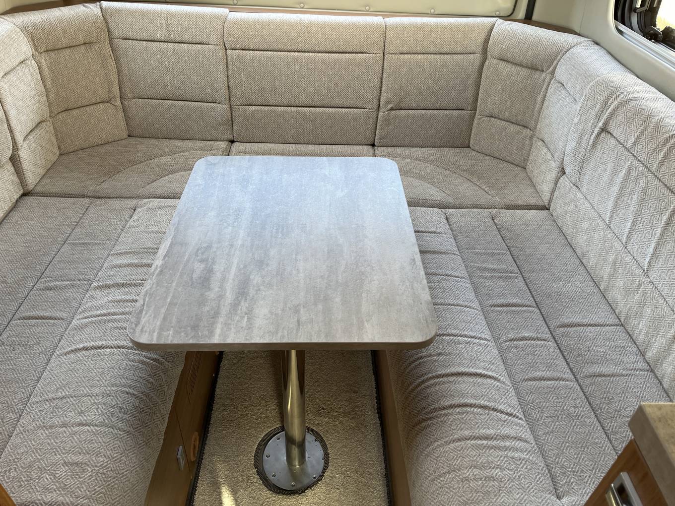 U-shaped lounge that converts into a full-width double bed. The kitchen is