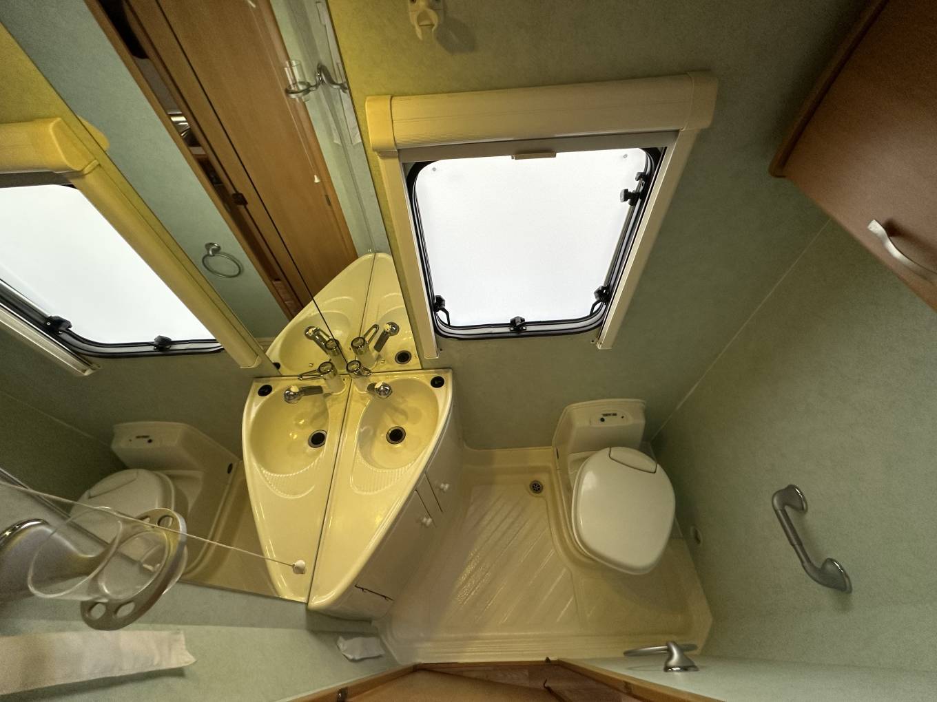 Central of the van is the well-equipped side kitchen comprising dual-fuel hob with electric hot plate, oven, grill, microwave and 3-way fridge. Opposite sits the washroom this houses the vanity sink, cassette toilet and shower area with folding divider wall.