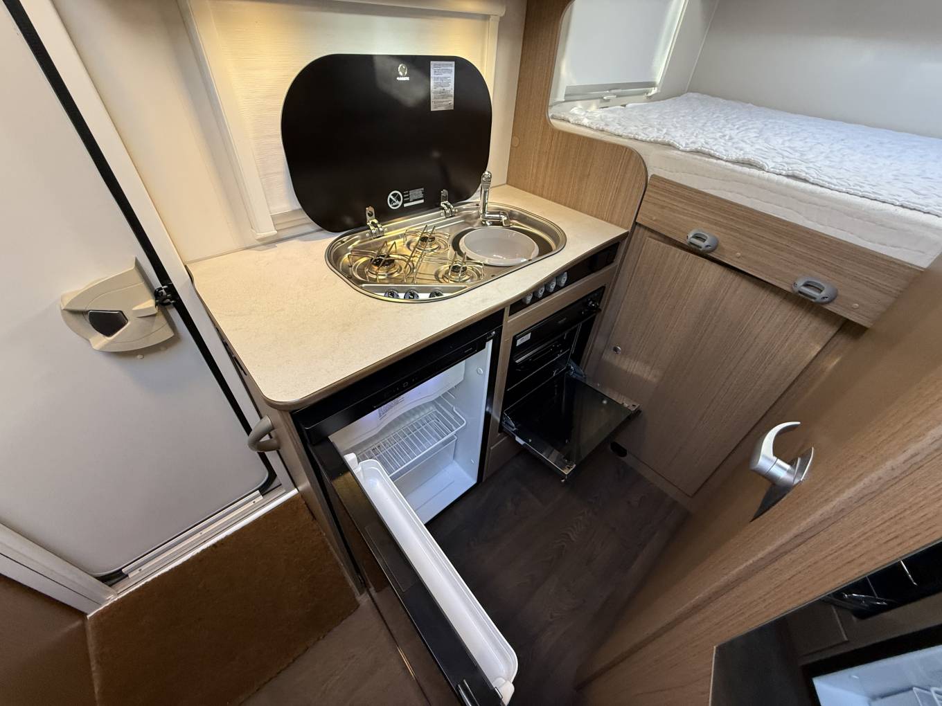 To your left is the Kitchen where you will find a Three Burner Gas Hob, a combined Oven and Grill, a Three energy source Thetford Fridge, a sink with a hot and cold mixer tap plus worktop and cupboard space.