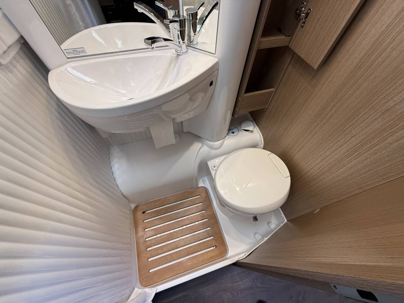 Opposite is the bathroom featuring a Thetford Flushing Cassette Toilet, a Wash Handbasin and a clever folding section creating a separate Shower Cubical.