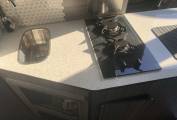 The kitchen is equipped with a stainless sink, a two burner gas hob and a 240v fridge freezer which can also operate with the onboard inverter.