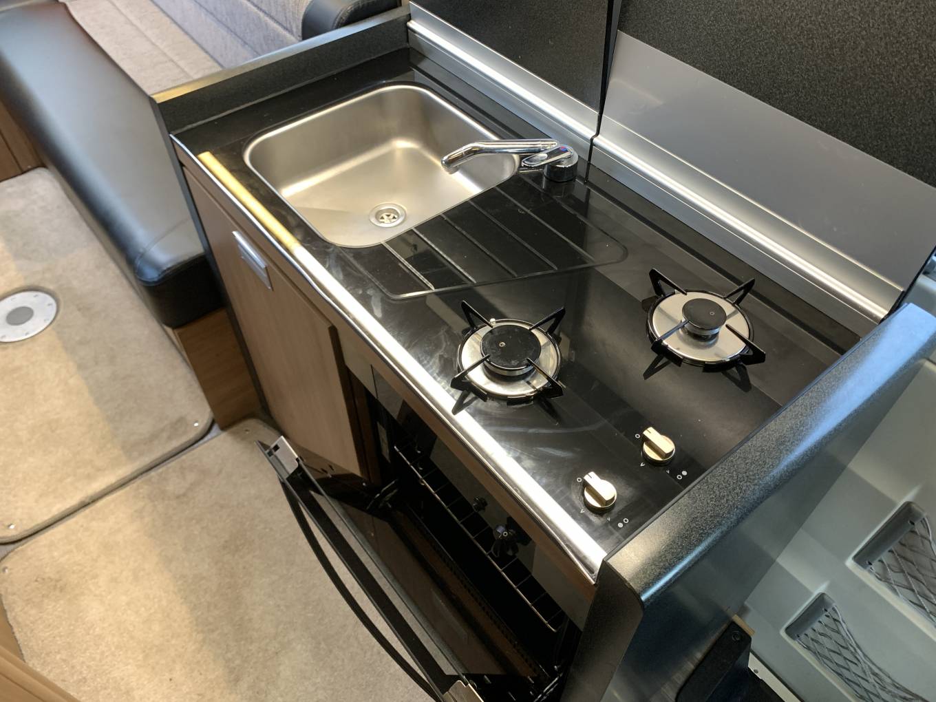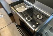 The high gloss low maintenance one piece hob and sink hidden under hinged plinths when not in use give the interior a sleek modern look and will appeal to many looking for that little bit extra.