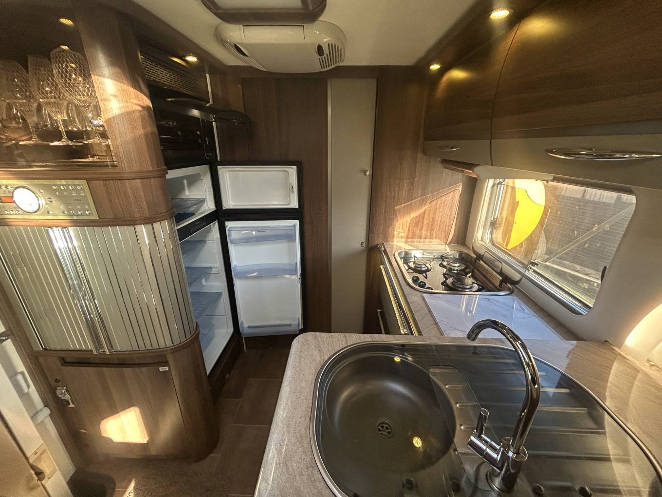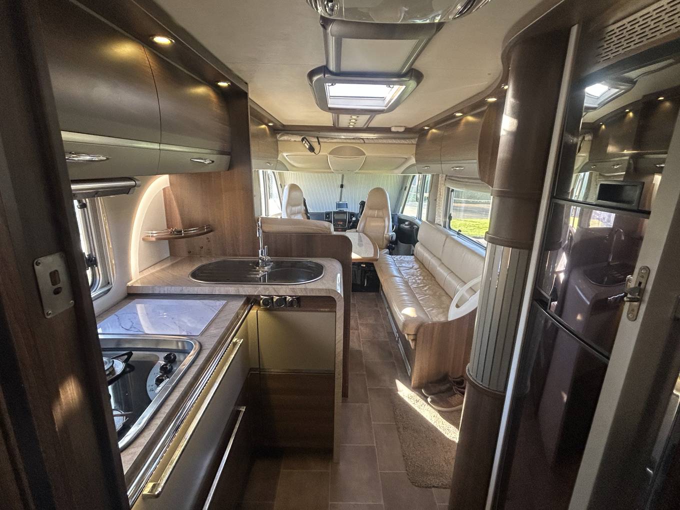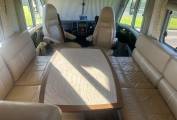 As mentioned, this motorhome has a fantastic internal layout. At the front you have spacious lounge which is made up with the two captains chairs, one long side facing sofa and a further L-shaped sofa - all in leather finish that is in really good condition for the age. There is a centrally located multi-directional table that is perfect for an evening meal or even to work from, browse a laptop or read the paper. Moving back you have an extremely well equipped kitchen area giving you everything you need to prepare a meal. It comes with a gas hob with 3 burners, sink with mixer tap and on the other side there is a tec tower with oven on top of a large 3-way fridge with separate freezer. There is loads for storage space including draws and cupboards.