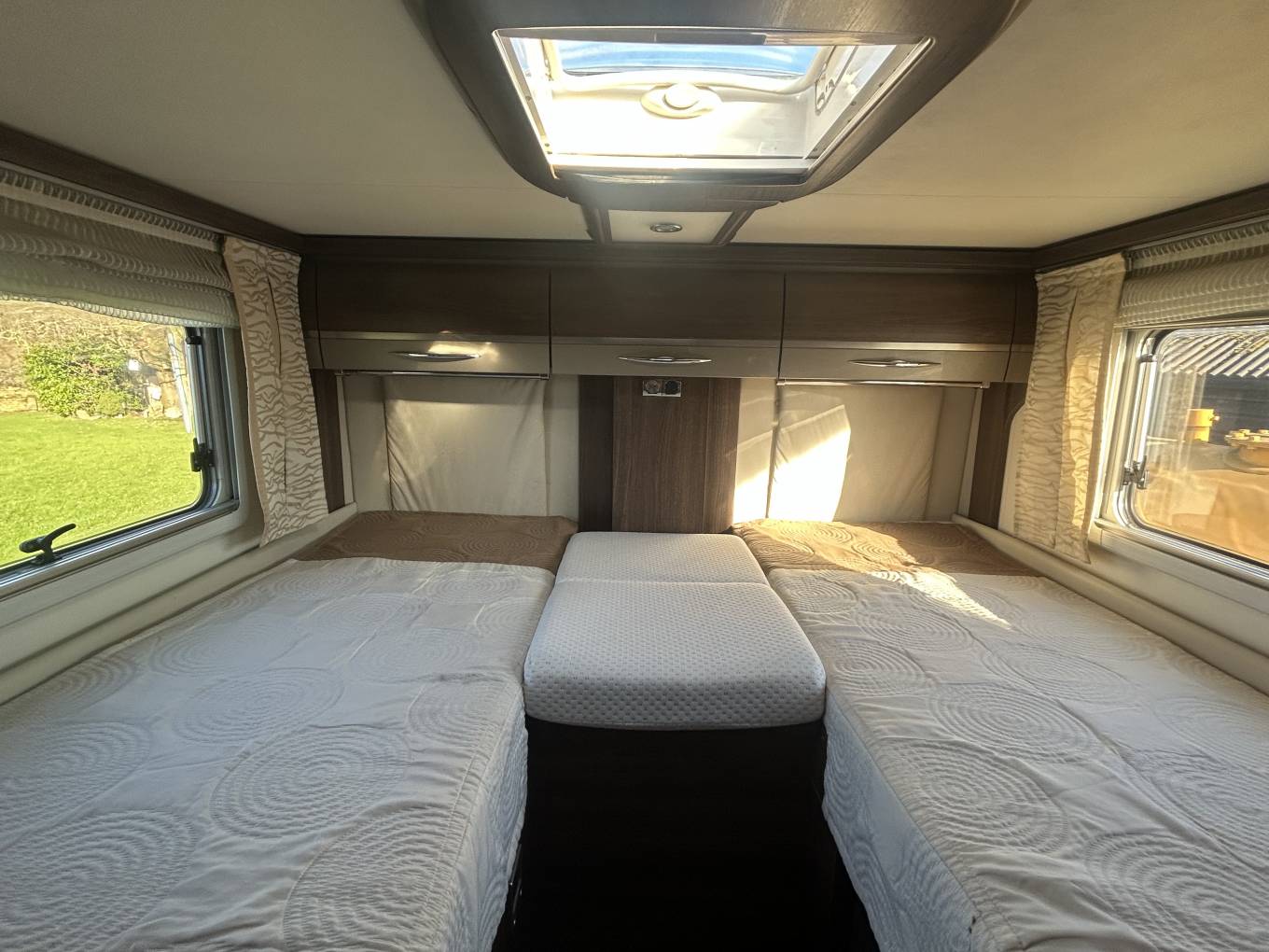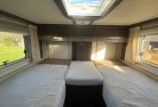 The Burstner Elegance is extremely comfortable to sleep in. You have rear fixed beds which are two singles with an adjoining central section (singles 195cm x 75cm), a large electric drop-down double at the front and a further large single/small double that can be made out of the long side sofa. There is a central washroom with Dometic flush toilet and sink on one side and a separate shower on the other. Heating and hotwater are provided via the much sort after Alde Wet Heating system.