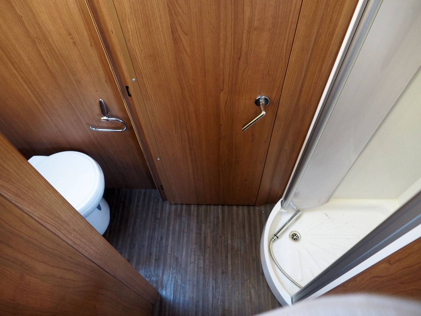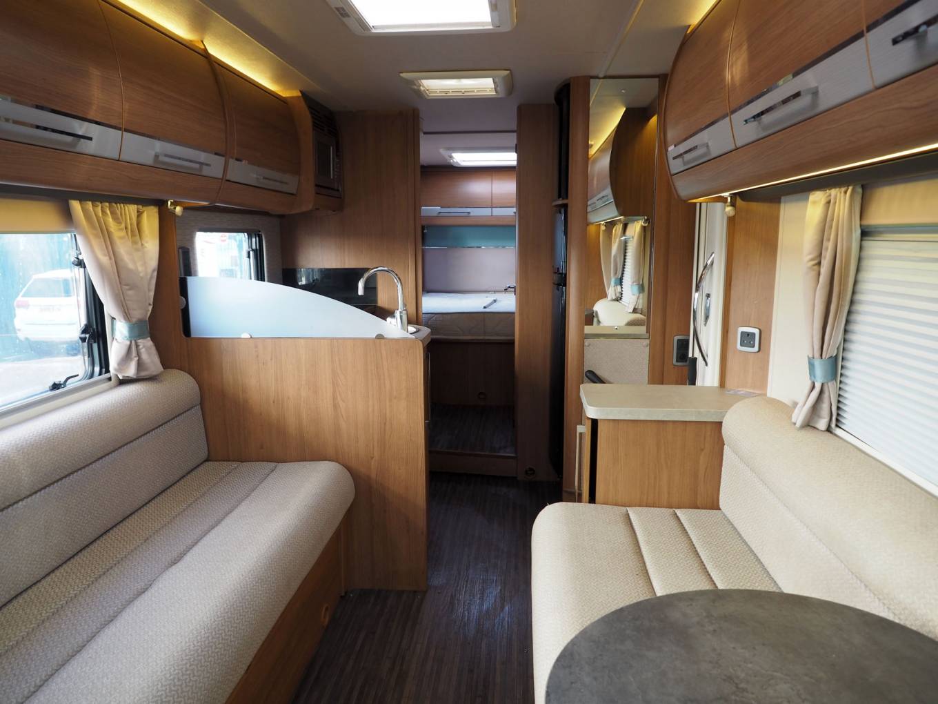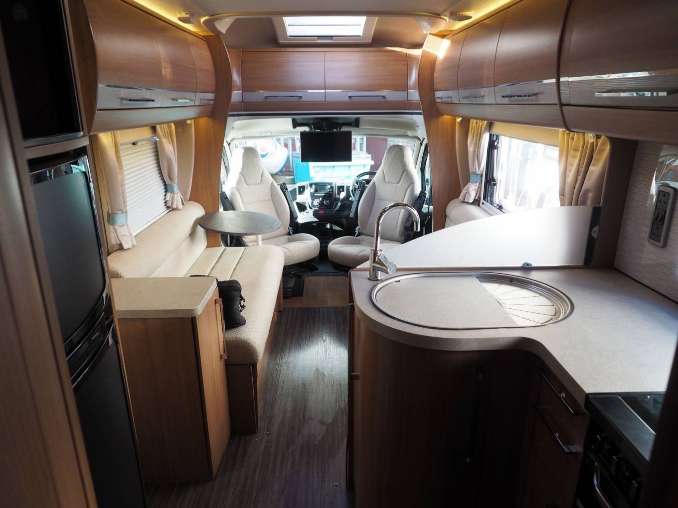 The forward dinette offers excellent living space with twin full length settees and swivel cab seats, six or more can sit here for a social. The dinette can also convert to a double bed if required. There are 2 seatbelts in total. Midships you will find a fully equipped kitchen including dual fuel hob, gas oven and grill, microwave and large fridge freezer. There is a solid partition offering privacy for the adjacent washroom, separate shower and changing area. To the rear is the island bed with wardrobes either side, lockers and corner units. There is an underbed store here too and from the outside, a full width store for all manner of accessories with an external door each side.