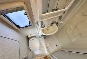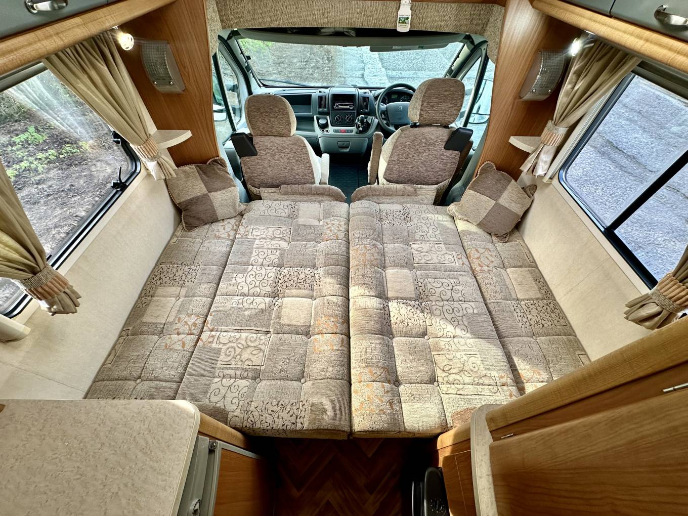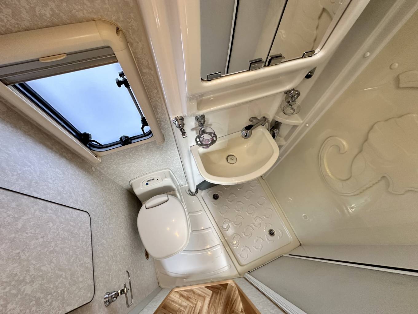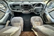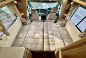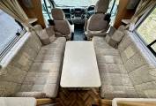 At the rear of the motorhome, you will find the well-equipped kitchen area. The kitchen features a full sized oven with separate grill, a three-burner gas hob with 1 electric hot plate, and a stainless steel sink with mixer tap and drainer. The 3 way fridge with a freezer compartment ensures that your ingredients stay fresh, allowing you to enjoy home-cooked meals even while travelling. Moving forward you will find the functional bathroom including a swivel Thetford cassette toilet, a wash basin with a mixer tap, and with the versatile configuration of the washbasin panel, a separate shower allowing you to stay refreshed on your travels. In the heart of the motorhome, you will find the lounge area. Here you have 2 side facing sofas which are great to relax on after a busy day. As the night draws in these quickly and conveniently pull together to make a large double bed. For dining there is a freestanding table which neatly stores away in a cupboard once you have finished with it. Throughout the motorhome there is plenty of storage.