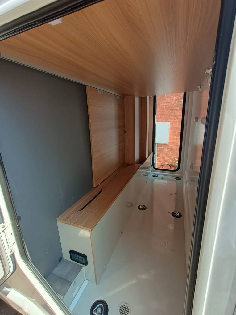 whole width of the motorhome, kitchen, 2 sofas with travelling seats with electric drop down bed above. All contained within the Alu-Tech