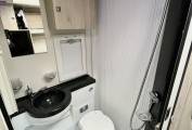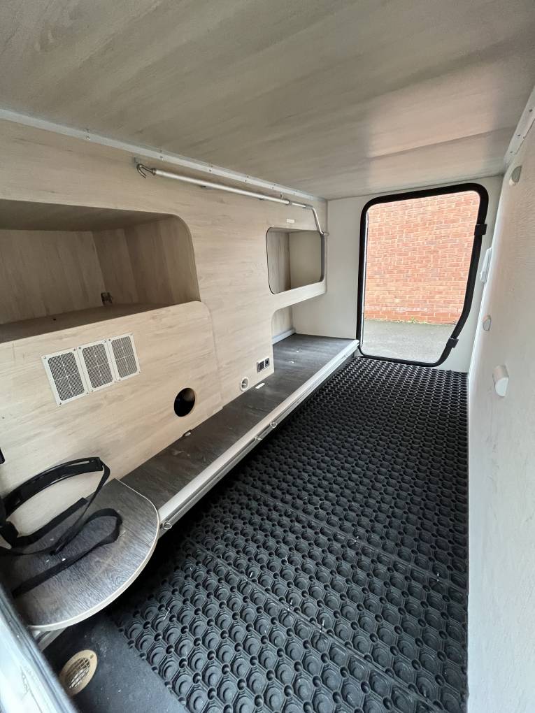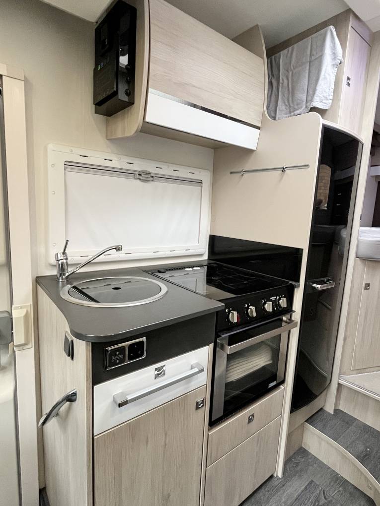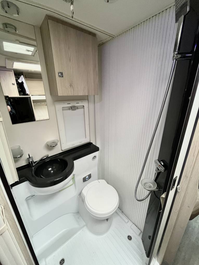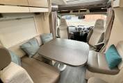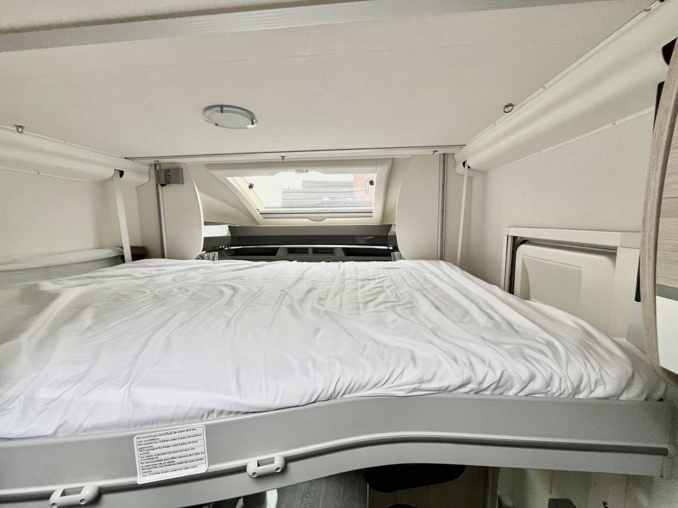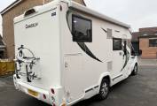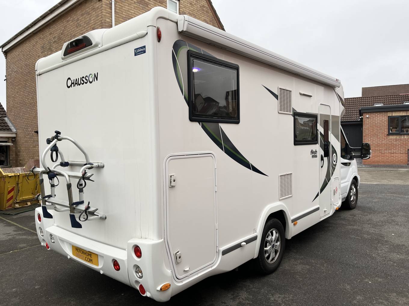 On the outside of the van we have alloy wheels, front fog lights, 120W solar panel, Fiamma wind out canopy awning, access panel for gas bottle, twin rear access doors to the large internal rear garage, 2 cycle bike rack, rear reversing camera, access panel for the toilet cassette and access to the Chausson techni box locker