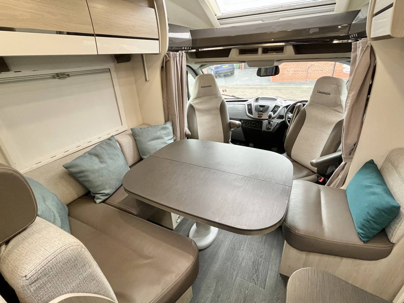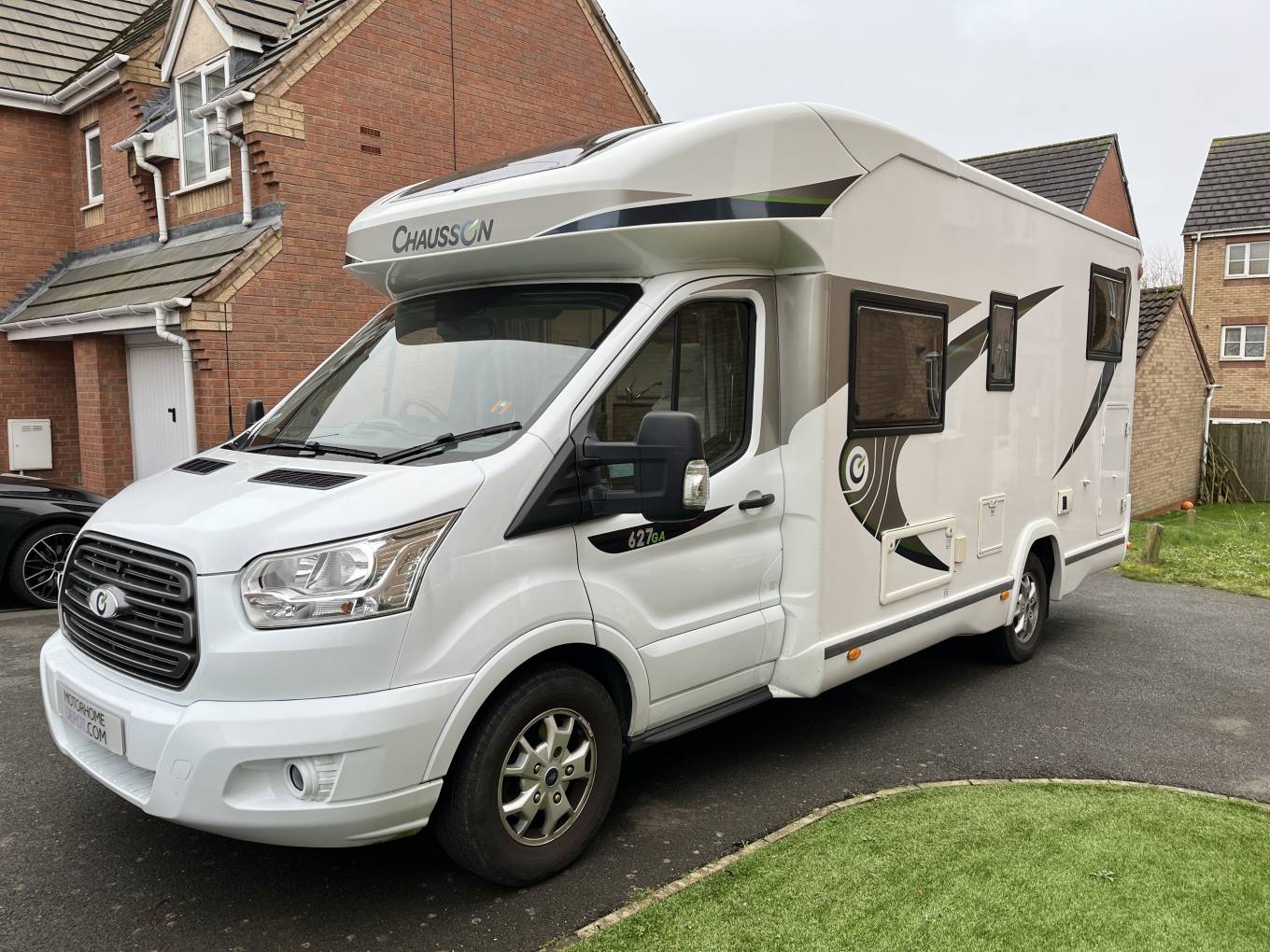 Motorhome Depot West Leicester are delighted to offer this 2018 / 18 plate Chausson 627 GA 4 berth motor home based on the 2.0L ford chassis with the 6 speed Automatic gearbox. Once in the cab we have cab air conditioning, cruise control, automatic gear shifter, rear reversing camera, panoramic roof light, full cab/windscreen blinds, curtains to separate cab from habitation area, twin swivel captains seats and plenty of over cab storage areas. To rear of the cab we have the lounge area, comprising of an L shaped lounge and a seperate single seat, lounge has the advantage of two traveling seats and belts, a height adjustable swivel table and habitation blinds and fly screens, above the lounge area is a good sized electric drop down double bed. Behind the lounge is the well equipped galley kitchen comprising of sink with hot & cold water, 3 burner hob ( 1 electric hot plate / 2 gas burners), combination oven and grill, tall 3 way fridge with freezer compartment and plenty of additional kitchen storage space.Opposite the kitchen is the shower / toilet room comprising of electric flush toilet, shower, wash basin, mirror and bathroom storage. The rear bedroom has the advantage of fixed twin single beds which can be converted to a large double bed if required, below each single bed is a good sized storage area along with hanging space for clothes and again plenty of overhead cabinets for storage. Heating and hot water is supplied by a Truma blown air system.