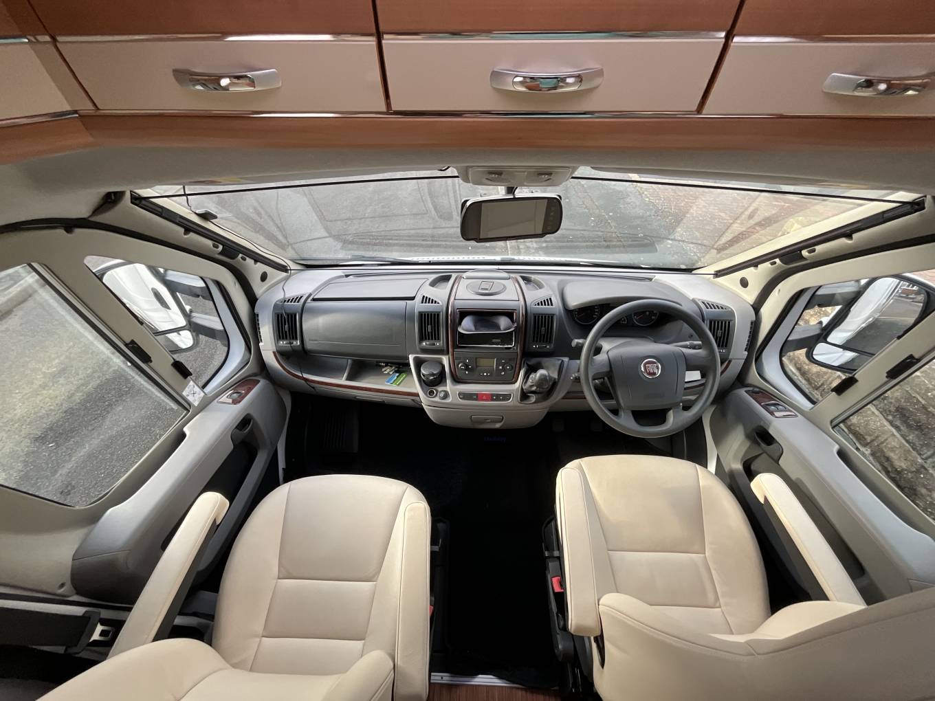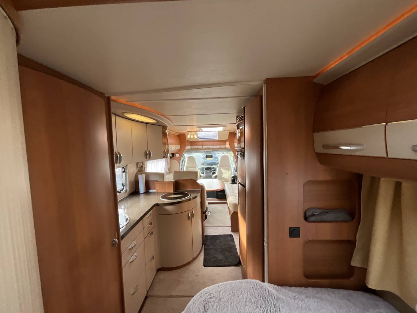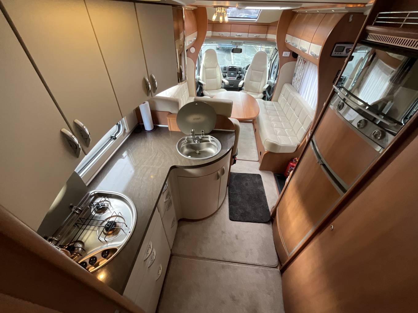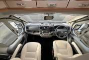 Starting at the rear of this well designed motorhome is the desirable, fixed double bed. Adjacent to this is the practical washroom including a Thetford cassette toilet, wash basin with mixer tap and separate shower. Moving forward you will find the well-equipped kitchen area including a three burner hob, combination oven and grill, stainless steel sink with mixer tap, large fridge/freezer and plenty of workspace. In the heart of the motorhome is the spacious front lounge area featuring a large dining table, twin swivel captain’s chairs and seating that can easily accommodate dining for up to 8 people. This light and airy space is perfect for entertaining or relaxing and has been recently upholstered in a stylish cream leather fabric. As evening nears this area easily converts into a comfortable double bed, completing this 4 berth motorhome. There is copious amounts of storage throughout this motorhome in the form of lots of kitchen storage, under bed and all-round eye level cupboards, as well as two wide and full drop wardrobes.
