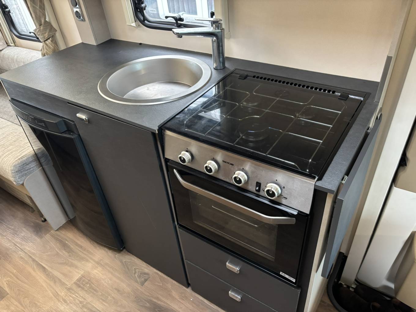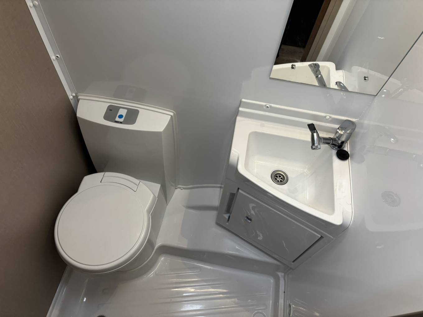 As a 6 berth motorhome, it can comfortably sleep 6 people. The rear lounge can be made up into a double bed, as well the front lounge area and then the spacious overcab double bed. The layout has been designed to maximise lounging space with both a front and rear lounge with the rear lounge including a fixed table to allow plenty of dining space. The habitation area has been fitted with a heating system. The kitchen is located in the centre of the vehicle and is well equipped, including a Thetford oven/grill, 4 ring burner hob, Dometic fridge/freezer, microwave and a sink/tap area. The washroom is located just behind the kitchen and includes a shower which has never been used by the current owners, toilet, ceramic sink, tap and vanity mirror.
